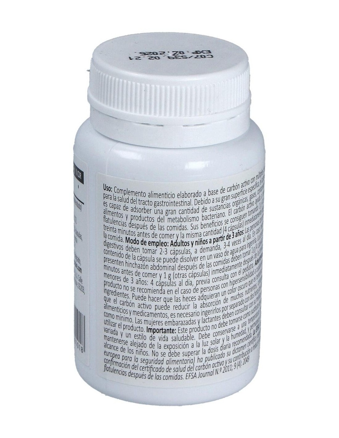 250 mg de carbón activo medicinal obtenido por carbonización de cáscara de coco.