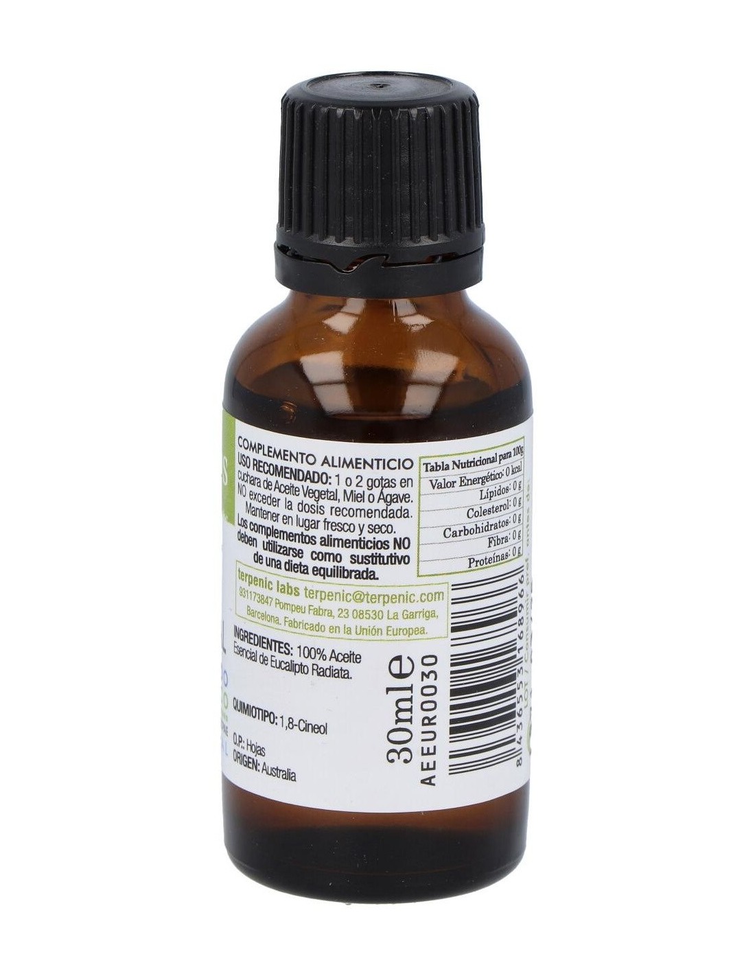 TERPENICAceite esencial de Eucalipto radiata. El producto es 100% extracto natural con origen en Australia, el cual contiene ecoetiqueta que certifica el origen ecológico dentro de la unión europea.