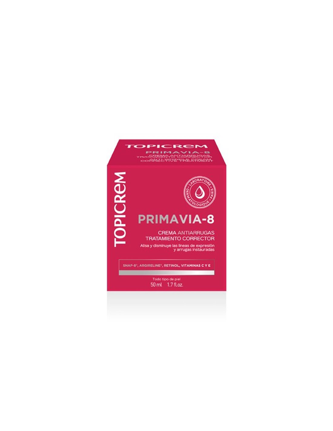 TOPICREMCrema anti-arrugas de expresión. Crema intensiva para la prevención y tratamiento de la formación de arrugas expresión. Novedosa fórmula que combina tres péptidos que actúan con sinergia decontracturante. Proporciona una altísima eficacia en la prevención y tratamiento de las arrugas de expresión, ya que ayuda a minimizar los efectos de la gesticulación facial suavizando y neutralizando las marcas de expresión. Primavia-8 Crema decontracturante antiarrugas presenta en su conjunto propiedades protectoras del colágeno, decontracturantes y relajantes a nivel cutáneo, hidratantes, antioxidantes y reparadoras. Filtro solar SPF 15.