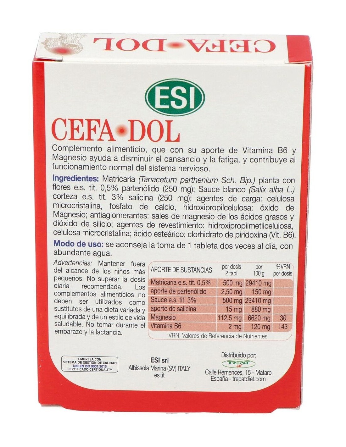TREPATDIET-ESICefadol de ESI es un complemento alimenticio útil para favorecer la relajación de forma natural y disminuir la tensión muscular. Indicado en aquellas