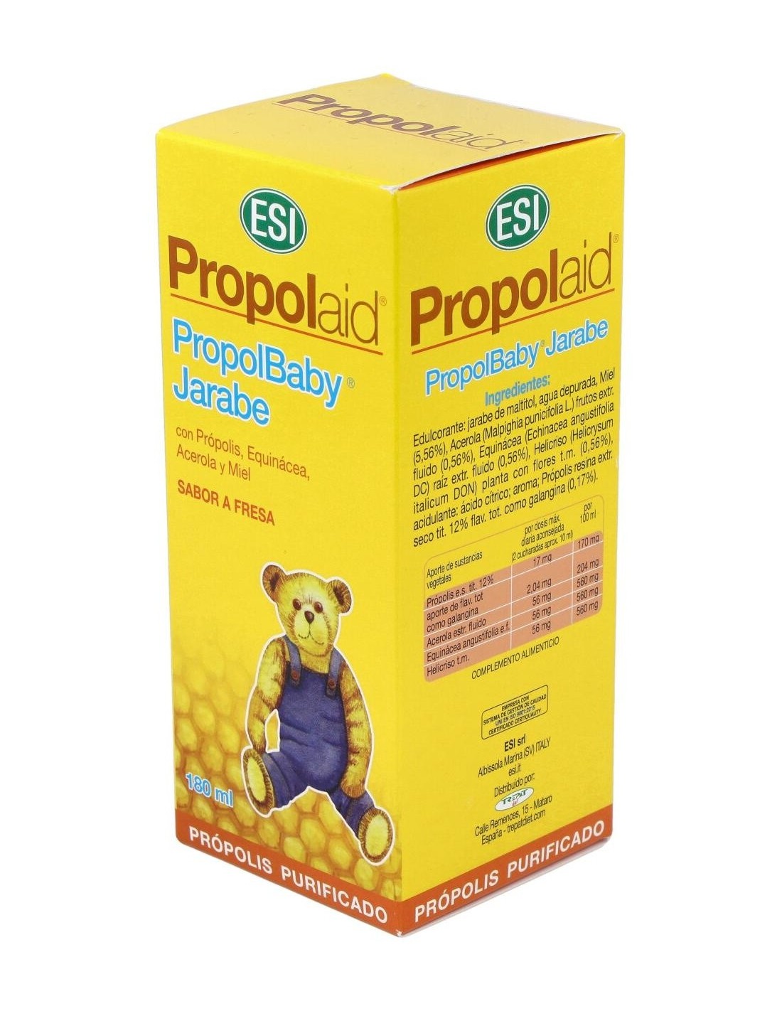 Ingredientes: Edulcorante: jarabe de maltitol, agua purificada, Miel (5,56%), Acerola (Malpighia punicifolia L.) frutos extr. fluido (0,56%), Equinácea (Echinacea angustifolia DC) raíz extr. fluido (0,56%), Helicriso (Helichrysum italicum Roth G. Don.) planta con flores extr. hidroalcohólico (0,56%) acidulante: ácido cítrico; aroma; Própolis resina extr. seco tit. 12% flav. tot. como galangina (0,17%).Modo de empleo: Niños entre 3 y 8 años: Tomar de 2 a 3 cucharaditas al día.Para mayores de 8 años: Tomar 2 o más cucharadas al día. Presentación:Envase de 180 ml.