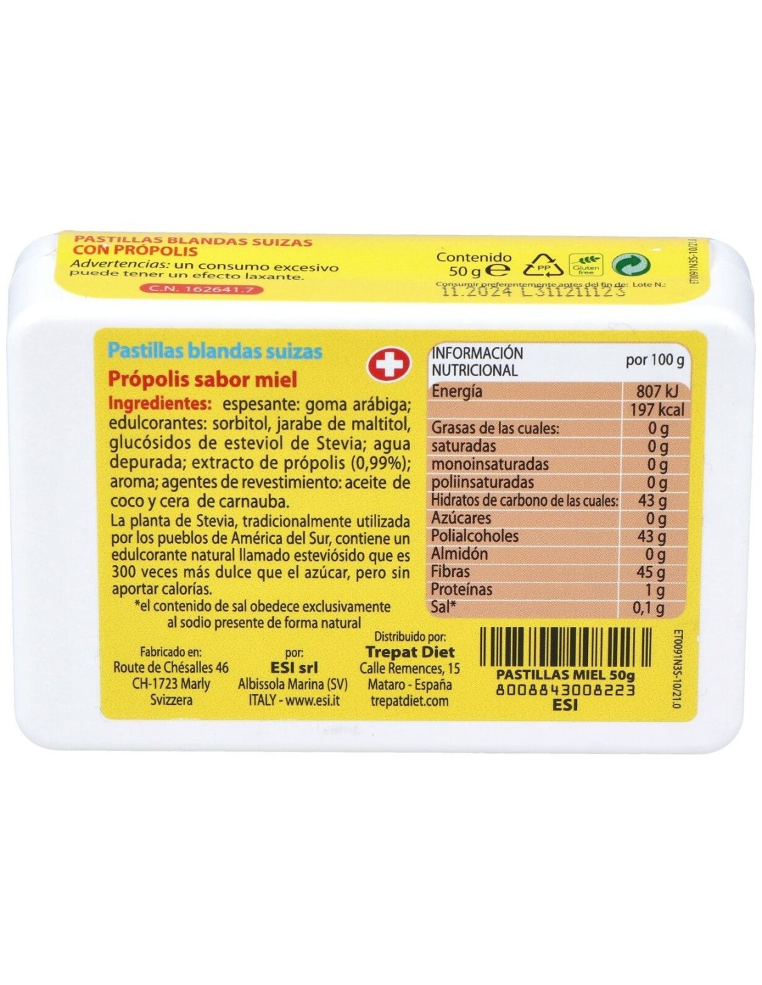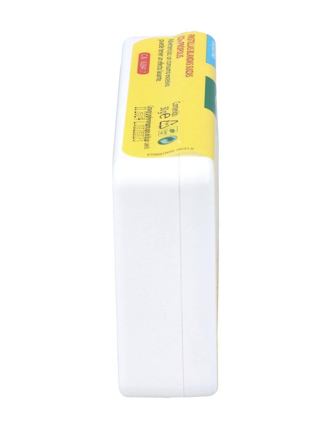Ingredientes:Espesante: goma arábiga; edulcorantes: sorbitol, jarabe de maltitol, glucósidos de esteviol de Stevia; agua depurada; extracto de própolis (0,99%); aroma; agentes de revestimiento: aceite de coco y cera de carnauba.Modo de empleo:Dejar deshacer en la boca lentamente.Presentación:Envase de 50 gramos sabor miel.Recomendaciones y advertencias:Apto para vegetarianos. No contiene gluten, derivados lácteos, lactosa, azúcar y conservantes añadidos, colorantes artificiales.