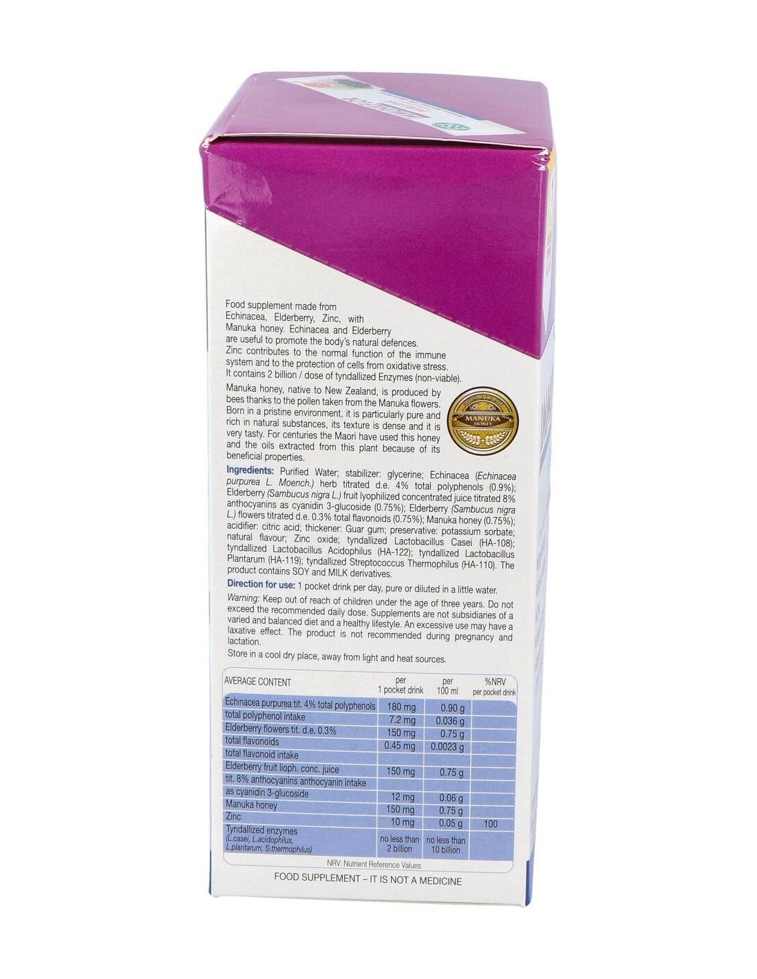Este producto favorece las defensas inmunitarias del organismo para prevenir y/o combatir el resfriado, gripe y las infecciones de las vías respiratorias altas e infecciones de carácter general. La miel de Manuka tiene propiedades antibacterianas y los fermentos lácticos tindalizados ejercen una rápida acción inmunoestimulante a nivel intestinal. Propiedades de los principios activos: