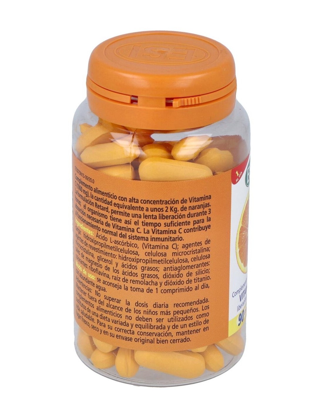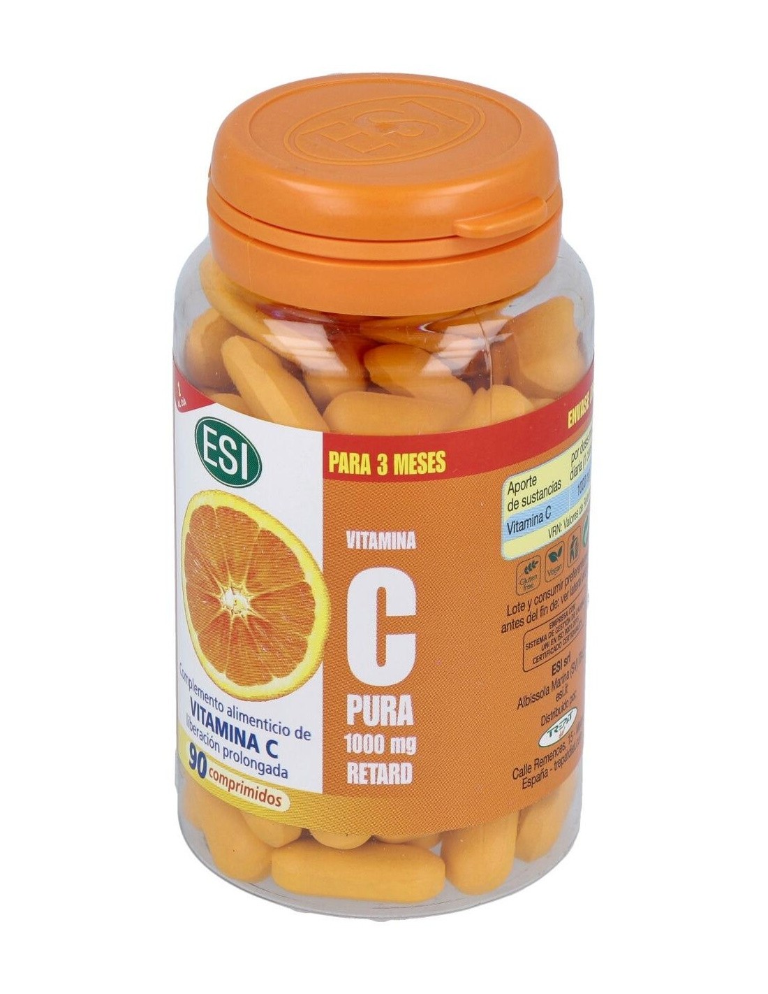 ESI Vitamina C Pura Retard 1000mg 90comp es un complemento alimenticio de vitamina C de liberación prolongada, que actúa durante 3 horas para que el organismo pueda absorber la cantidad necesaria. Contiene una alta dosificación de vitamina C, equivalente de 2 kg de naranjas, y está indicada para adultos que tengan déficit de esta vitamina.