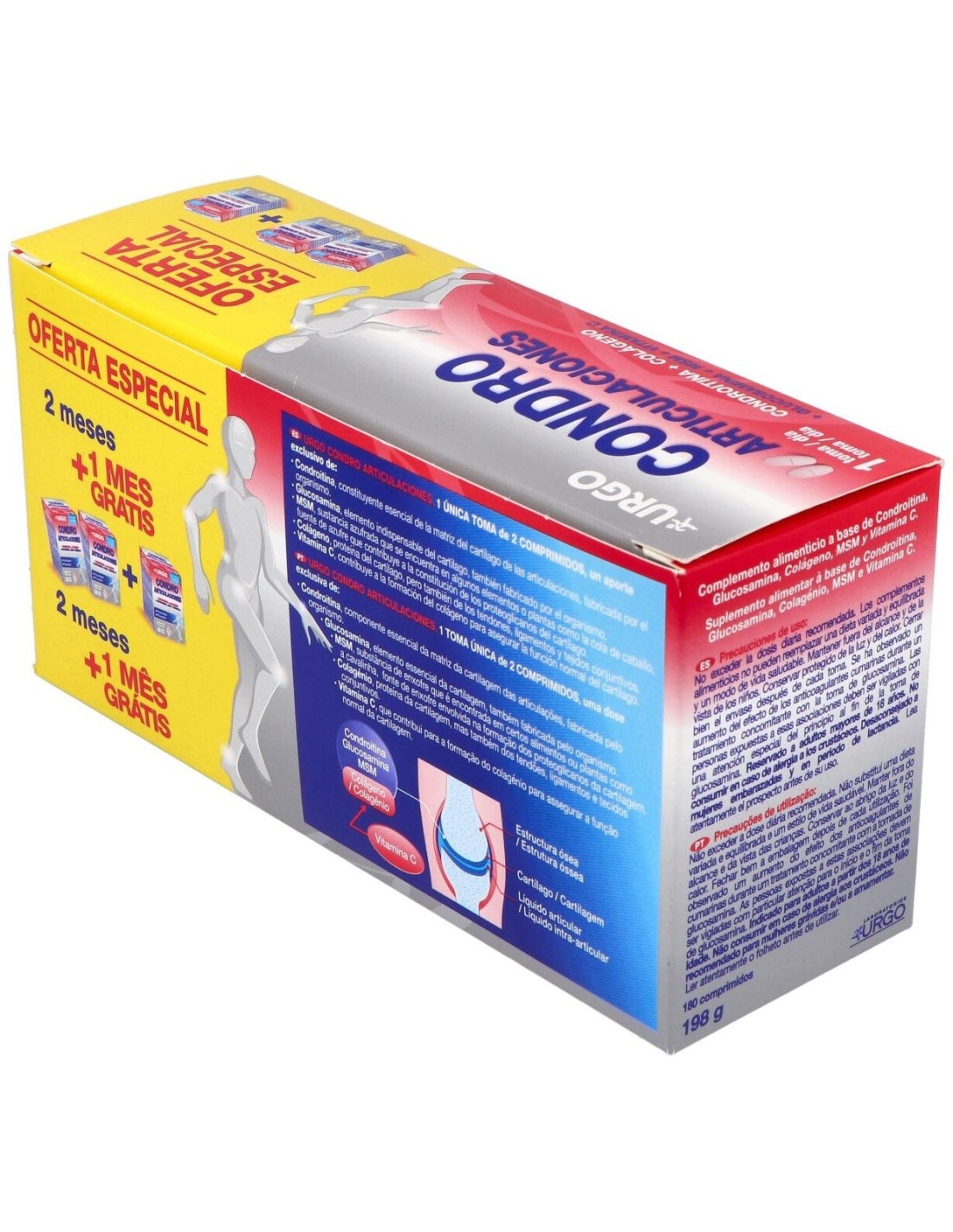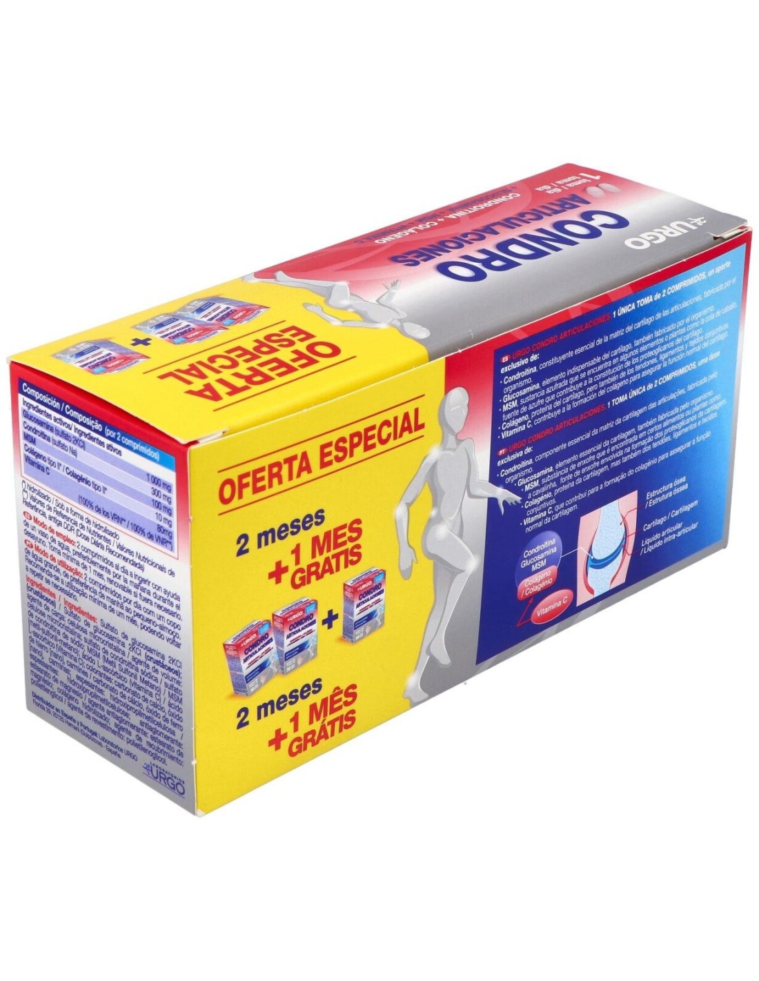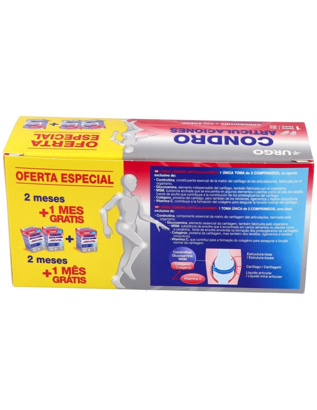 Complemento alimenticio formulado para contribuir al cuidado y bienestar de las articulaciones. Resulta en una mezcla de minerales y compuestos que resultan adecuados en la constitución del cartílago, ligamentos, tendones, uniones óseas y los huesos. La composición contiene: condroitina, glucosamina, colágeno, MSM y vitamina C con otros excipientes.