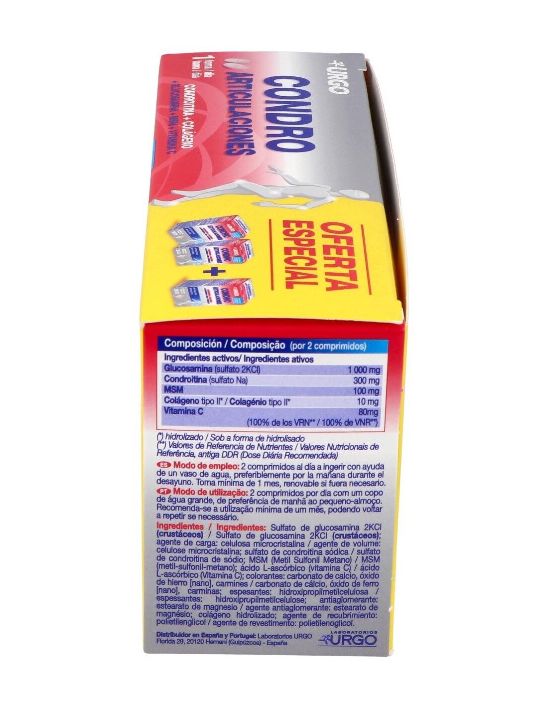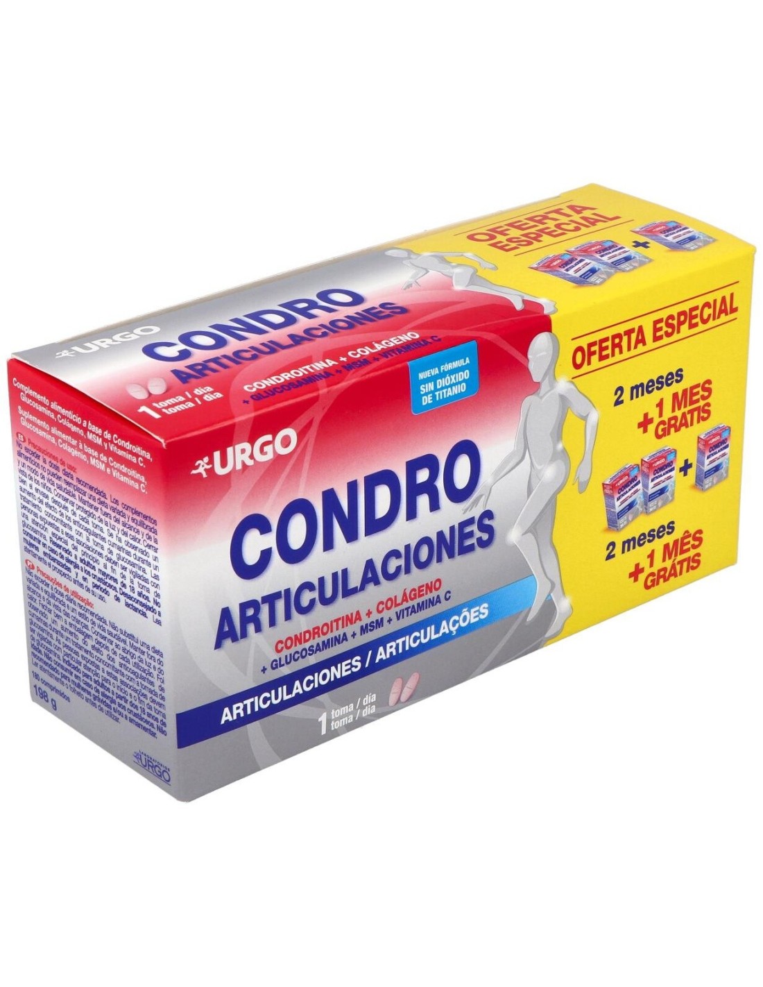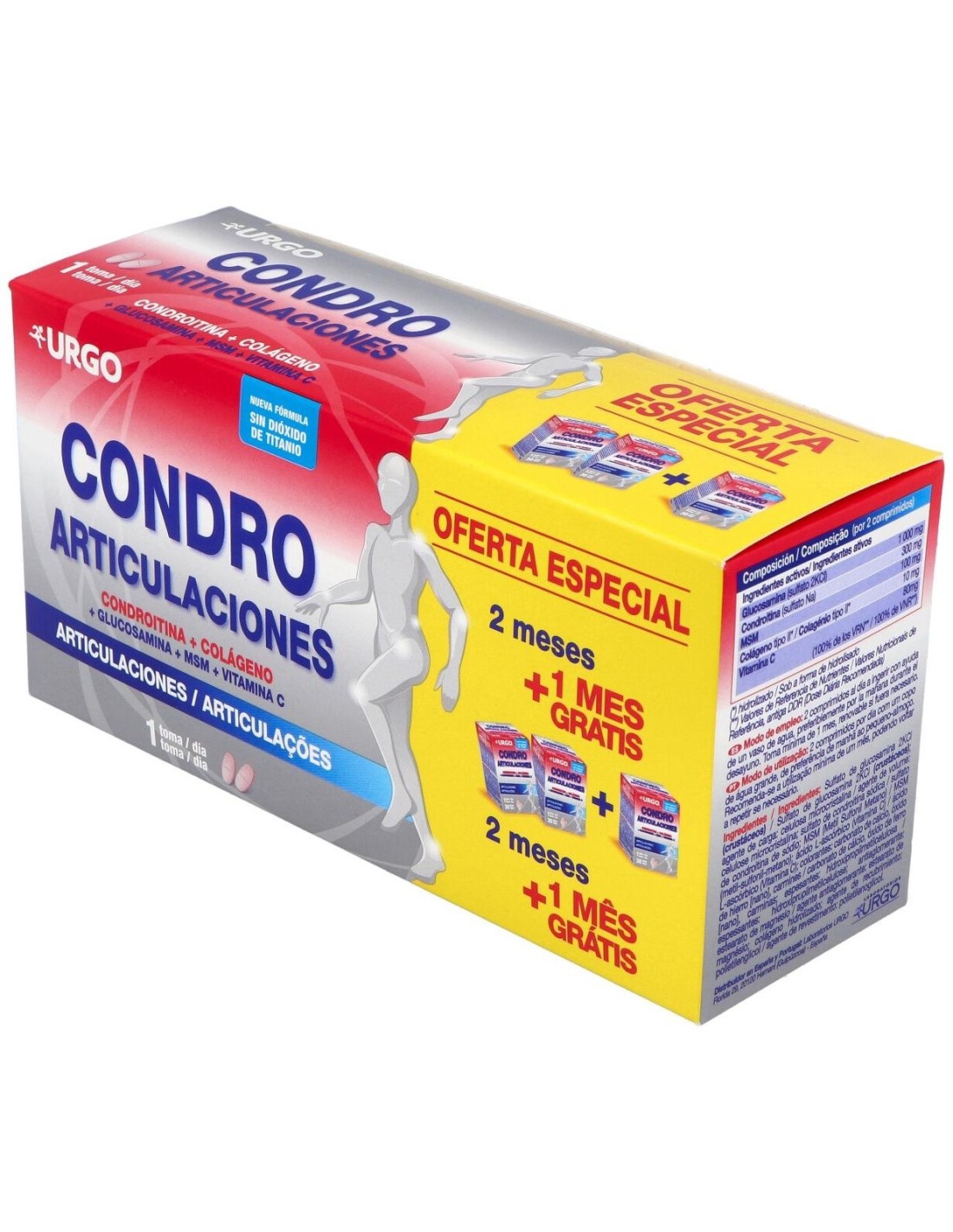 Complemento alimenticio formulado para contribuir al cuidado y bienestar de las articulaciones. Resulta en una mezcla de minerales y compuestos que resultan adecuados en la constitución del cartílago, ligamentos, tendones, uniones óseas y los huesos. La composición contiene: condroitina, glucosamina, colágeno, MSM y vitamina C con otros excipientes.
