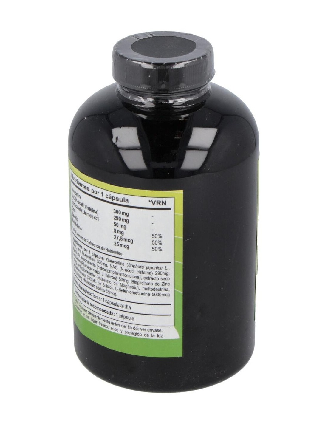 Quercetina (saphora japonica L, flores, 90% quercetina), NAC, Hidroxipropilmetilcelulosa, Extracto seco de llantén (plantago major L, hierba), Bisglicinato de zinc, Estearato de magnesio, Maltodextrina, Dióxido de silicio, L-seleniometionina, Molibdato sódico.