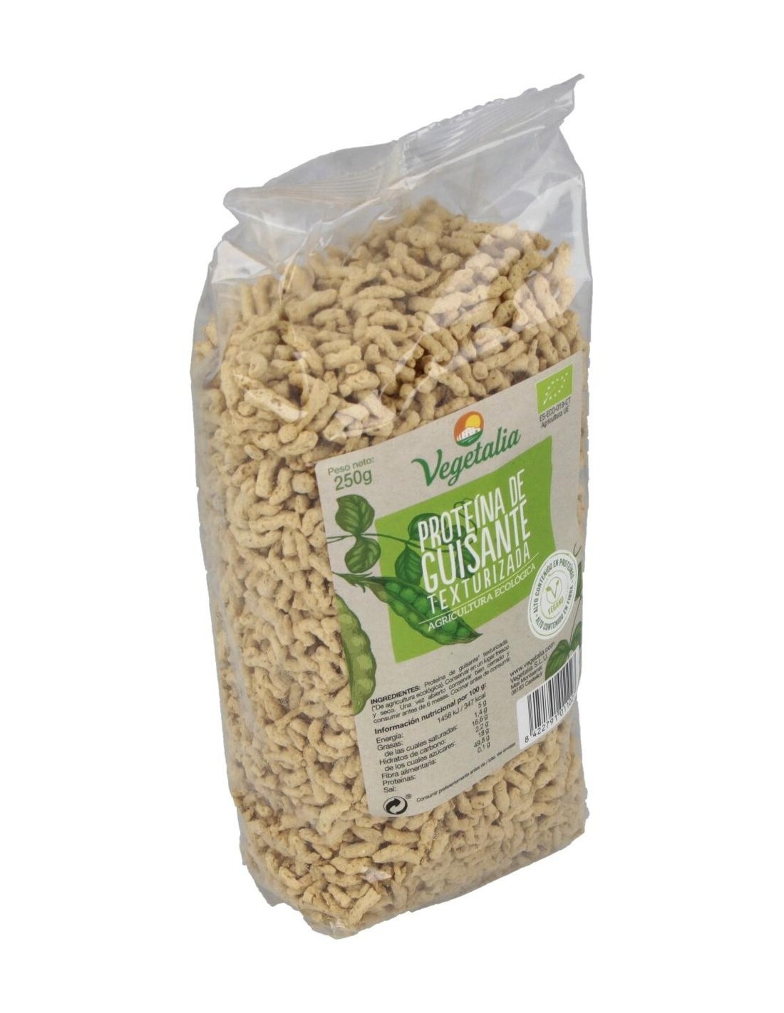 VEGETALIAProteína de guisante texturizada biológica con alto contenido en proteínas y fibras. Elaborado a partir de guisantes procedentes de agricultura ecológica, es un producto recomendado para reemplazar carnes y pescados.
