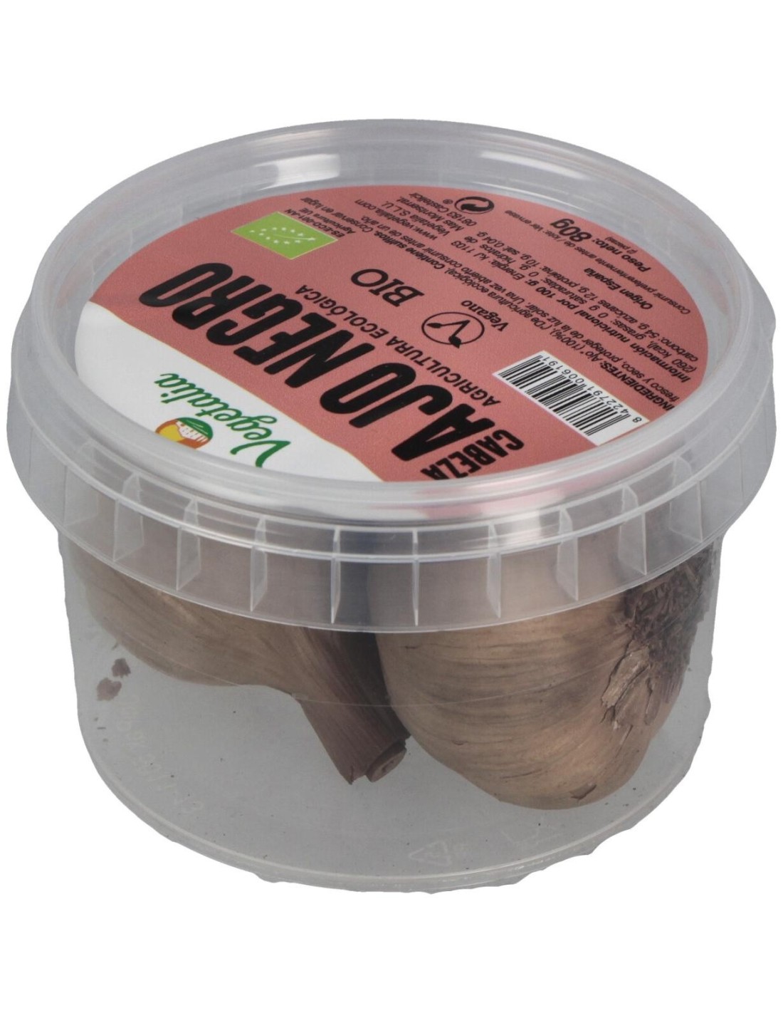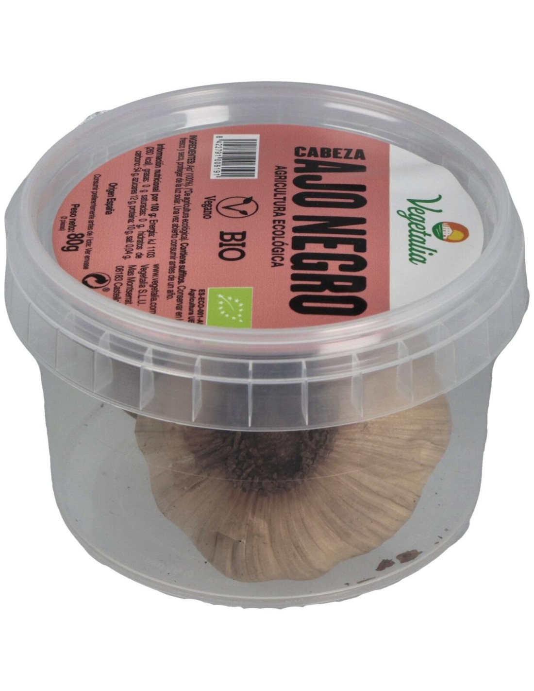 El ajo negro de Vegetalia se obtiene mediante un proceso controlado de fermentación que modifica sus compuestos originales, resultando en un alimento con características organolépticas particulares. Su formato en unidades facilita su almacenamiento y dosificación, adaptándose a diferentes usos en la cocina.