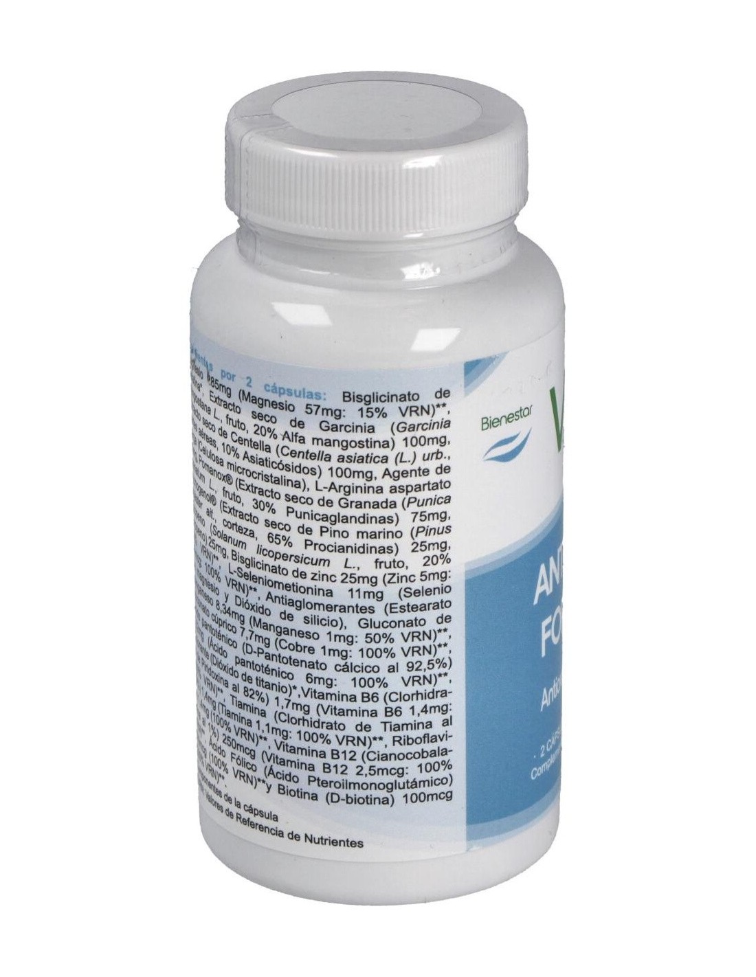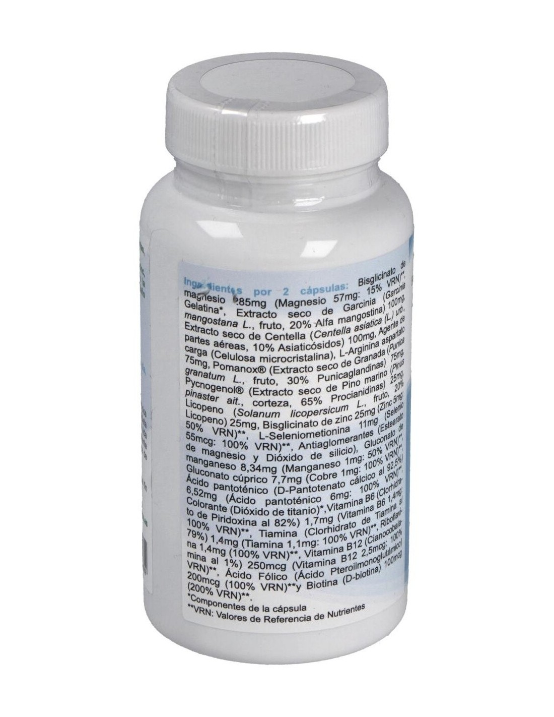 Bisglicinato de Magnesio, Agente de recubrimiento (gelatina y colorante dióxido de Titanio), Extracto seco de Garcinia (Garcinia mangostana L., fruto), Extracto seco de Centella (Centella asiatica (L.) urb., partes aereas), Agente de carga (celulosa microcristalina), L-arginina aspartato, Pomanox® (extracto seco de Granada (Punica granatum L., fruto), Pycnogenol® (extracto seco de Pino marino (Pinus pinaster ait., corteza), Licopeno (Solanum licopersicum L., fruto), Bisglicinato de Zinc, Seleniometionina, antiaglomerantes (estearato de Magnesio y dióxido de Silicio), Gluconato de Manganeso, Gluconato cúprico, Ácido pantoténico (D-pantotenato cálcico), Vitamina B6 (Clorhidrato de Piridoxina) Vitamina B1 (Clorhidrato de Tiamina), Vitamina B12 (Cianocobalamina), Vitamina B2 (Riboflavina), ácido fólico (Ácido pteroilmonoglutámico) y Biotina (D-biotina).