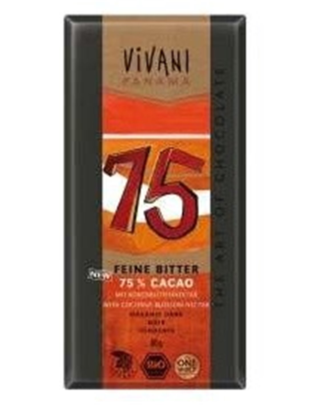 VIVANIIngredientes:Masa de cacao**, azúcar de flor de coco* 23 %, manteca de cacao**. Cacao: 75% mínimo. (*) Cultivado orgánicamente. (**) Certificación de