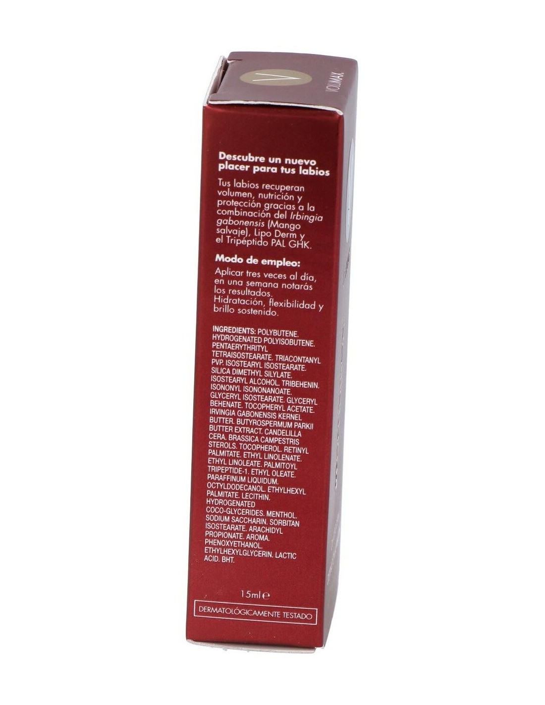 POLYBUTENE. HYDROGENATED POLYISOBUTENE. PENTAERYTHRITYL TETRAISOSTEARATE. TRIACONTANYL PVP. ISOSTEARYL ISOSTEARATE. SILICA DIMETHYL SILYLATE. ISOSTEARYL ALCOHOL. TRIBEHENIN. ISONONYL ISONONANOATE. GLYCERYL ISOSTEARATE. GLYCERYL BEHENATE. TOCOPHERYL ACETATE. IRVINGIA GABONENSIS KERNEL BUTTER. BUTYROSPERMUM PARKII (SHEA) BUTTER EXTRACT. EUPHORBIA CERIFERA (CANDELILLA) WAX. BRASSICA CAMPESTRIS (RAPESEED) STEROLS. TOCOPHEROL. RETINYL PALMITATE. ETHYL LINOLEATE. ETHYL LINOLATE. PALMITOYL TRIPEPTIDE-1. ETHYL OLEATE. PARAFFINUM LIQUIDUM. OCTYLDODECANOL. ETHYLHEXYL PALMITATE. LECITHIN. HYDROGENATED COCO-GLYCERIDES. MENTHOL. SODIUM SACCHARIN. SORBITAN ISOSTEARATE. ARACHIDYL PROPIONATE. AROMA (FLAVOR). PHENOXYETHANOL. ETHYLHEXYLGLYCERIN. LACTIC ACID. BHT.