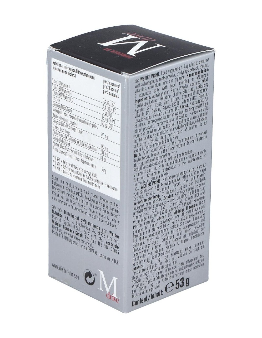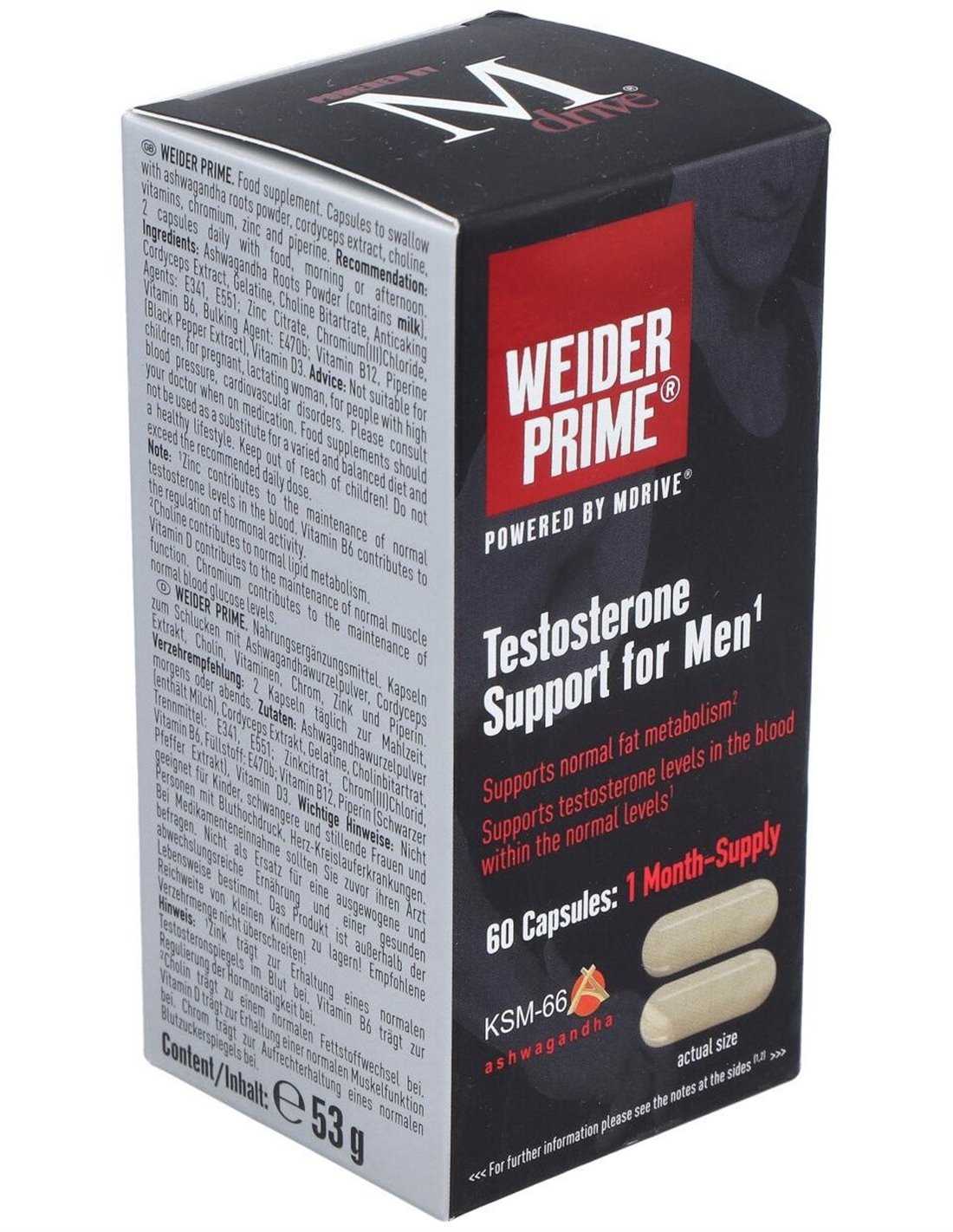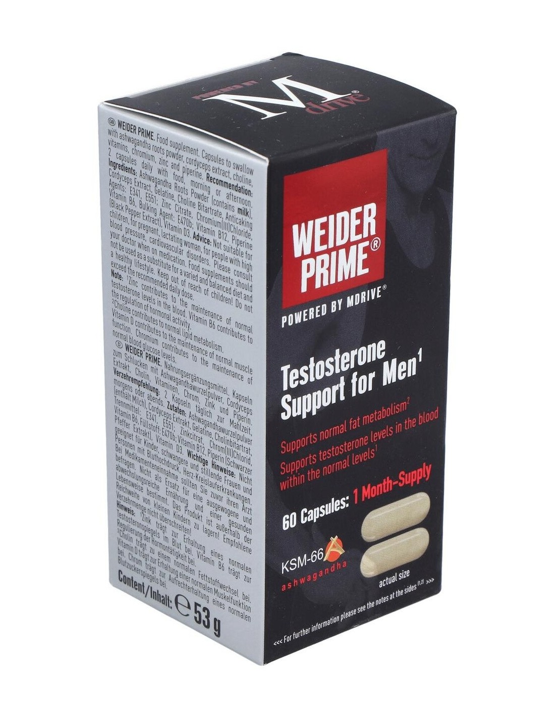 La testosterona es una hormona clave en el desarrollo y mantenimiento de la masa muscular, Weider Prime cuenta con una fórmula adecuada que ayuda a disminuir los efectos del estrés y los factores externos sobre la producción natural de testosterona y además proporciona los nutrientes necesarios en la producción de la misma.