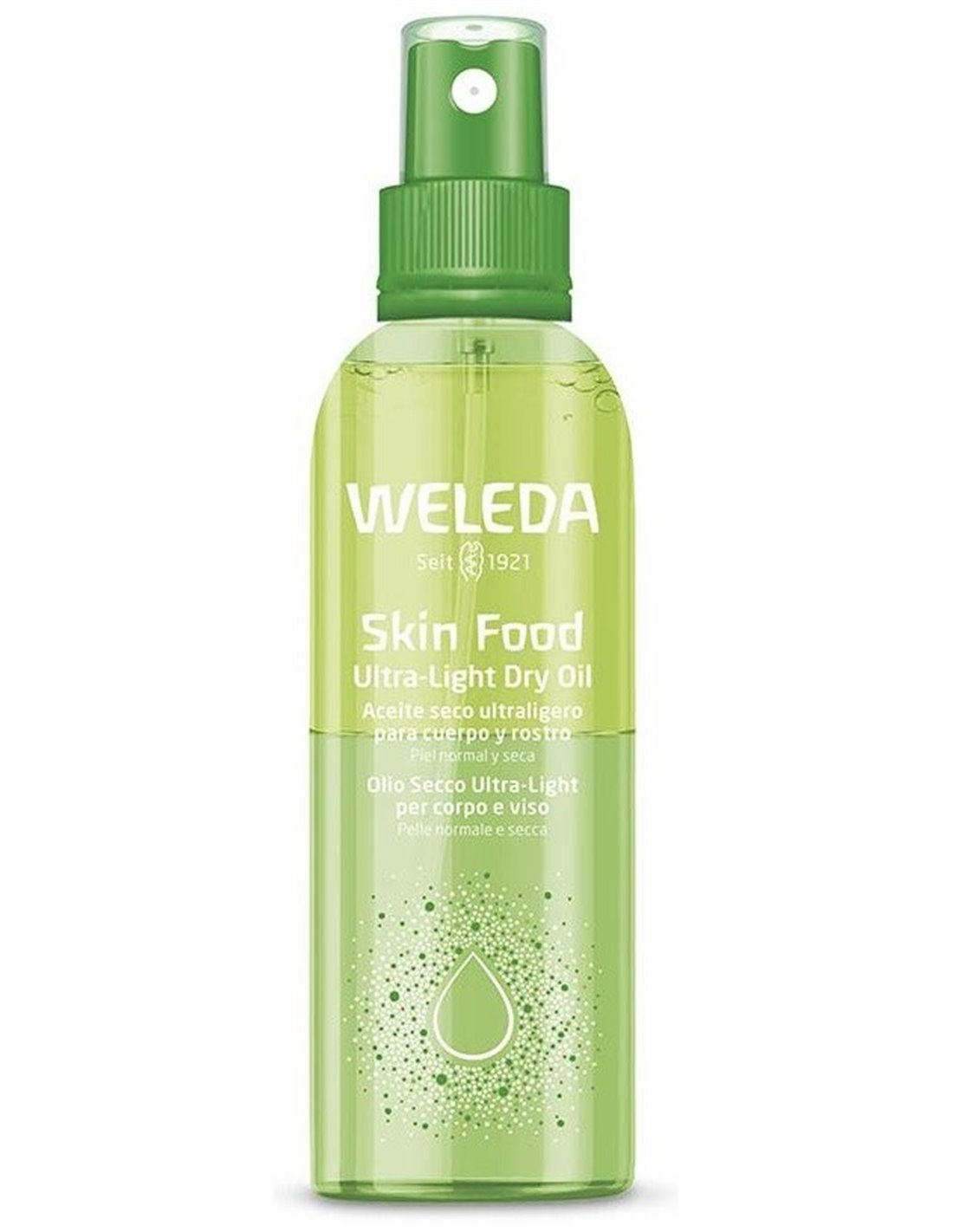 WELEDAAceite iluminador nutritivo de textura ultraligera en formato spray. Con todos los beneficios de la fórmula Skin Food. Rápida absorción y sensación no