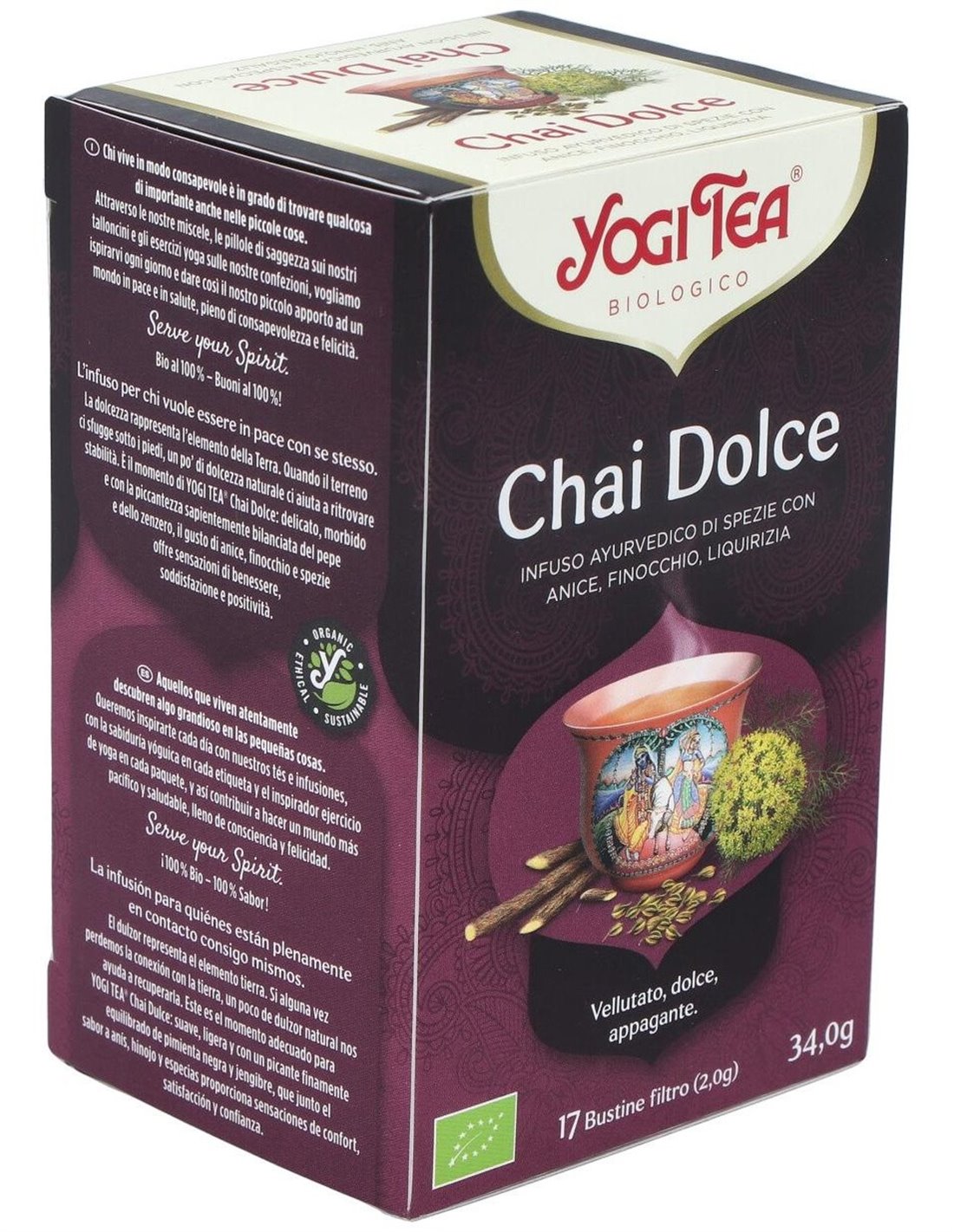 YOGI TEAEl Yogi Tea Chai Dulce 17 x 2 g es una infusión para amantes del té que combina especias y dulzura natural, ofreciendo una experiencia aromática equilibrada gracias a su mezcla tradicional de ingredientes.
