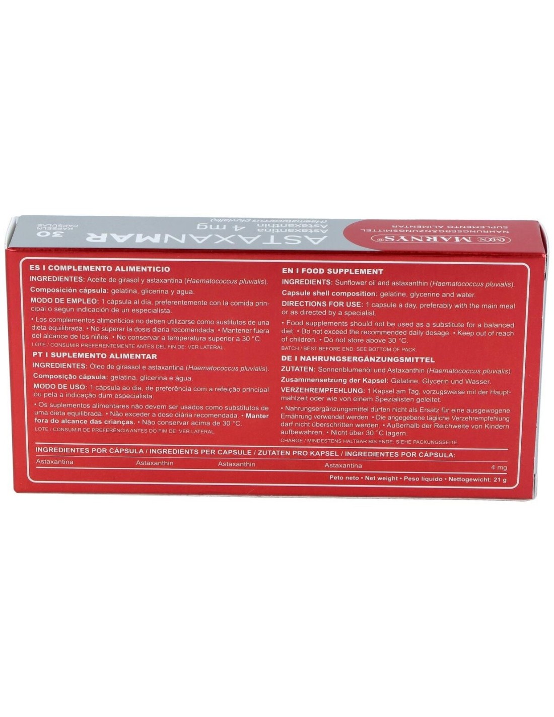Astaxanmar 30Perlas de Marnys es un suplemento diseñado para personas interesadas en complementar su dieta con un producto que contiene astaxantina, un compuesto reconocido por su perfil antioxidante. Es adecuado para quienes buscan apoyar su bienestar general mediante ingredientes naturales.