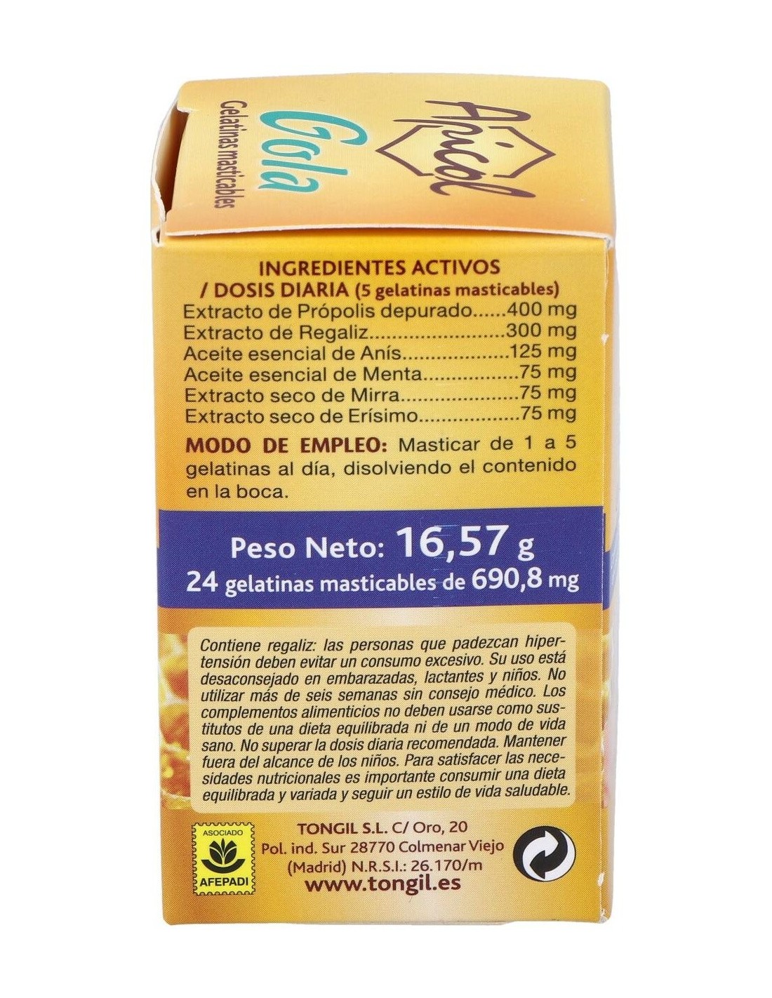 Apicol (Aligel) Gola Plus 24Perlas de Tongil ofrece una opción práctica para el cuidado de la garganta, adaptándose a las necesidades de quienes buscan un complemento fácil de usar y transportar.