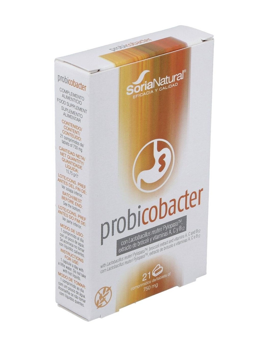 Complemento alimenticio destinado a ayudar a la eliminación de la Helicobacter pylori. Probiótico específico que actúa coagregados con Helicobacter pylori y facilitando su expulsión del organismo; además contiene extracto seco de brócoli, vitaminas y minerales que refuerzan la acción del probiótico, favorecen la regeneración y cicatrización del epitelio gastrointestinal y proporcionan un aporte extra de estos nutrientes al organismo.