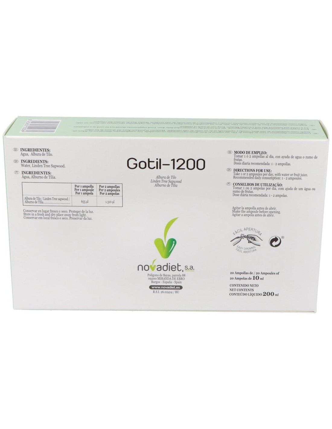 Gotil 1200 Envase de 20 ampollas de 10 ml. de Novadiet es un complemento diseñado para personas que buscan apoyar su bienestar diario mediante una fórmula cuidadosamente dosificada. Este producto se presenta en un formato práctico que facilita su incorporación en la rutina habitual.