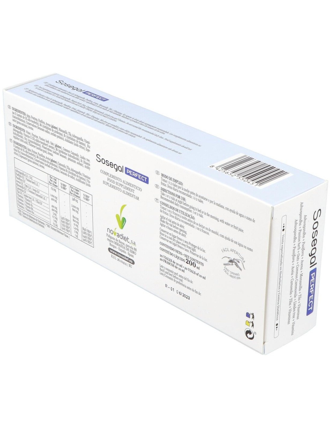 Los viales Novadiet Sosegal Perfect son tu aliado perfecto para esas épocas en las que estás más nervioso y alterado, con las consecuencias que ello conlleva, y te ayudará a estar más tranquilo y feliz durante el día y a descansar de forma adecuada durante la noche.Modo de empleoTomar 1 o 2 viales antes de acostarse.