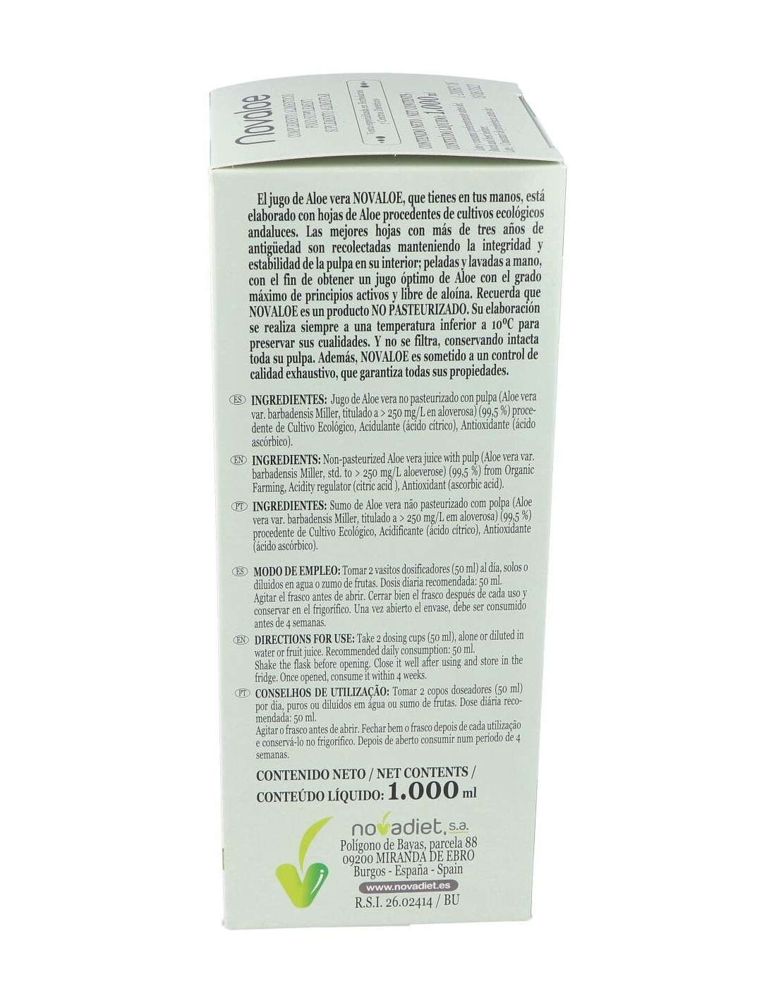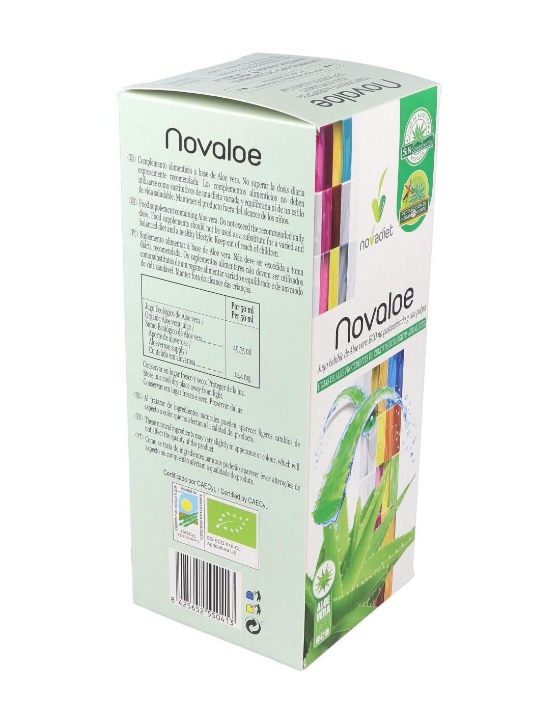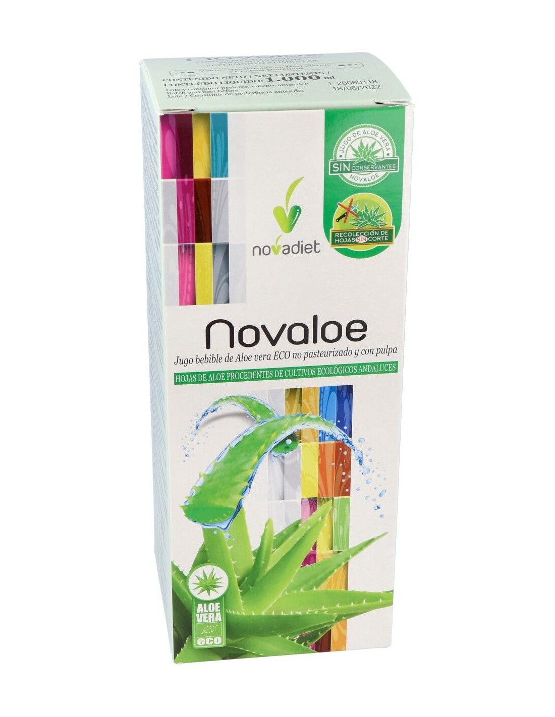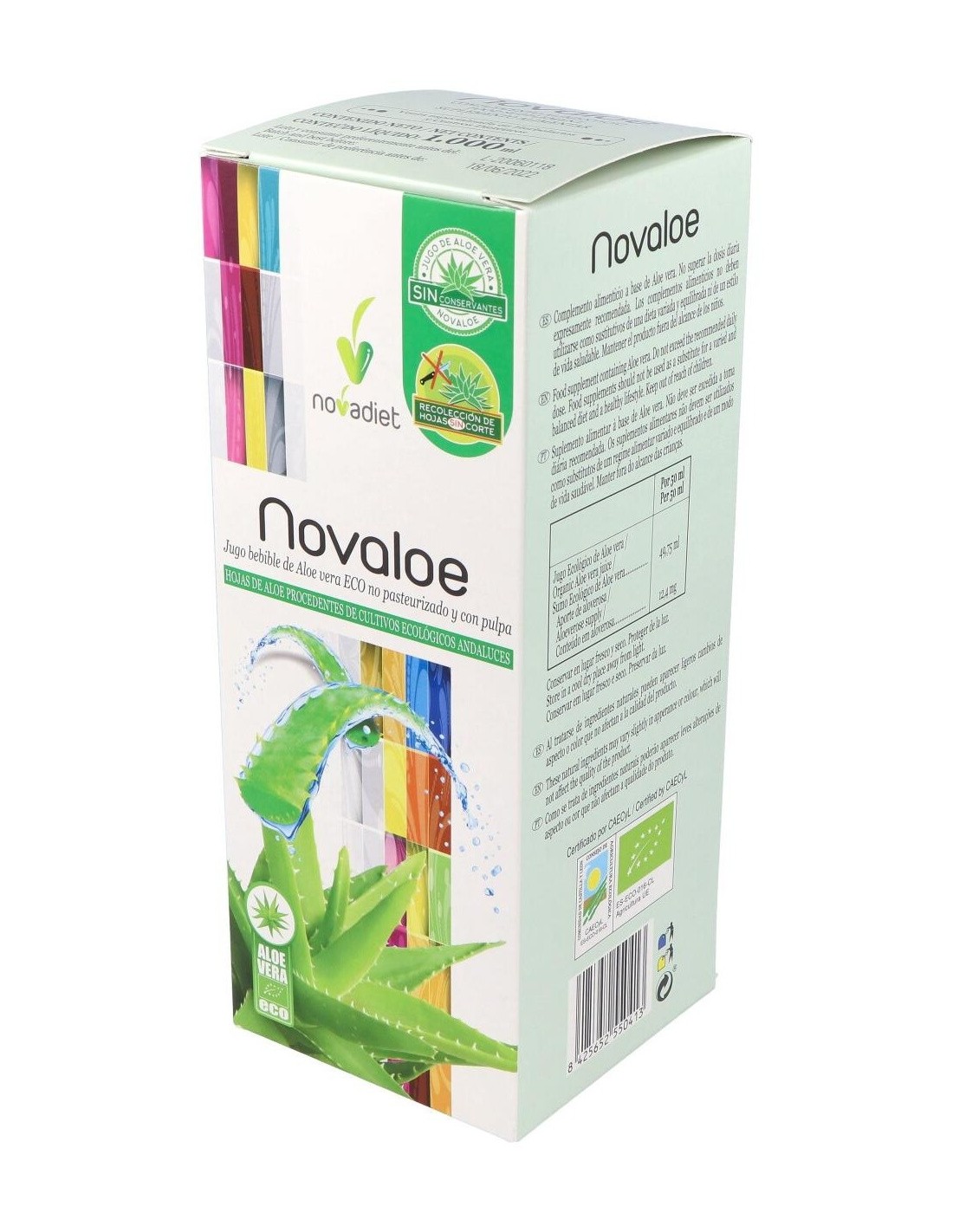 El jugo bebible de Aloe vera Novaloe está elaborado con hojas de Aloe procedentes de cultivos ecológicos españoles. Es un producto no pasteurizado que