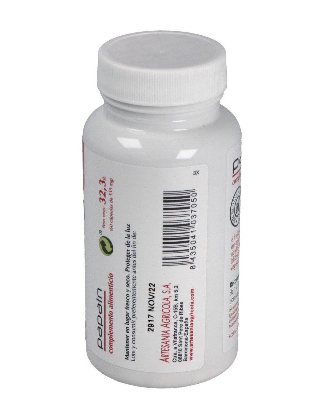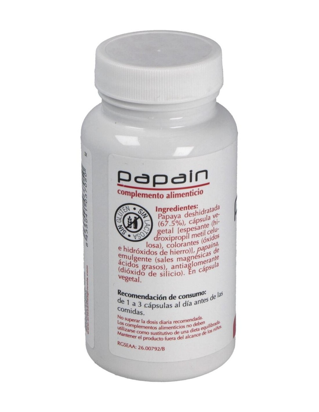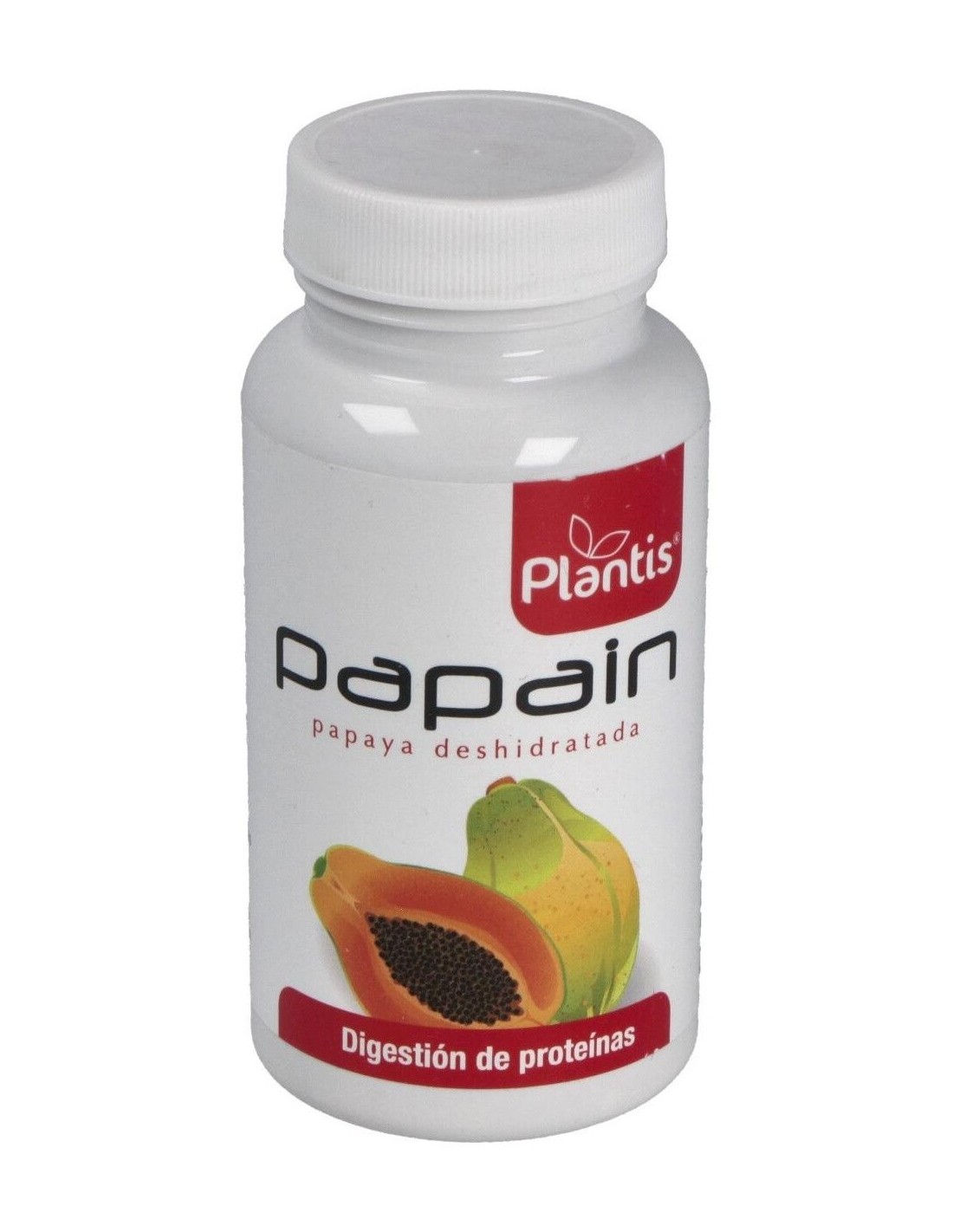 La papaya (Carica papaya L.) es un árbol de 4-8 m con un ramillete terminal de hojas lo que hace que se asemeje a una palmera, sus frutos son bayas de gran tamaño muy apreciados por su sabor. De los frutos antes de su madurez se obtiene por incisión el látex que es la parte usada popularmente gracias a sus beneficiosas propiedades digestivas.El látex es rico en enzimas proteolíticas como la papaína, y la quimopapaína que favorecen la digestión de las proteínas, así como en vitaminas y carotenos.Tradicionalmente la papaya se ha utilizado para el tratamiento de dispepsias, úlcera péptica, gastritis, insuficiencia pancreática exocrina, infecciones parasitarias intestinales (ascaridiasis, enterobiasis, teniasis, toxocariasis o tricuriasis).Papain de Plantis son cápsulas vegetales con un 94% de papaya deshidrata enriquecida con papaína para así potenciar los efectos de los enzimas naturales de la papaya.Actualmente nuestra alimentación no siempre es equilibrada y nuestra dieta comporta un consumo excesivo de proteínas que dificultan el proceso digestivo desencadenando en digestiones pesadas acompañadas de ardor de estómago, sensación de pesadez, etc. Con la ingesta antes de las comidas de cápsulas de Papain, favorecemos la digestión de las proteínas y por tanto el proceso digestivo.Ingredientes:Papaya deshidratada (67.5%), cápsula vegetal [espesante (hidroxipropil metil celulosa), colorantes (óxidos e hidróxidos de hierro)], papaina emulgente (sales magnésicas de ácidos grasos), antiaglomerante (dióxido de silicio).Modo de empleo:Tomar 1-3 cápsulas al día antes de las comidas.Presentación:Envase de 60 cápsulas.