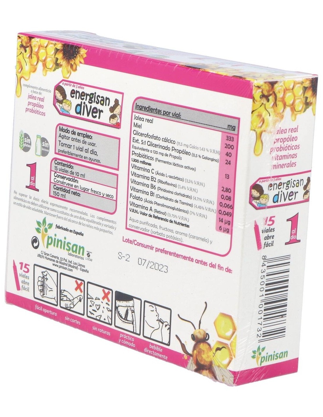 Energisan Diver está elaborada con materias primas seleccionadas que aseguran la calidad y concentración necesaria para disfrutar de los beneficios de este extraordinario regalo de la naturaleza. Además la hemos enriquecido con propóleo, probióticos, minerales y vitaminas, como la vitamina C que ayuda a disminuir el cansancio y la fatiga y contribuye al funcionamiento normal del sistema inmunitario. Presentada en práctico viales abrefácil y con un increible sabor a caramelo. Ingredientes por vial: