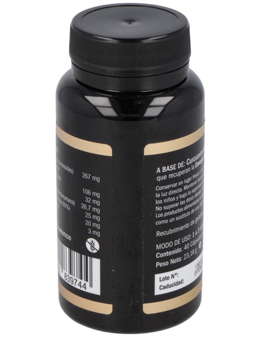 Curcuminoides .....................267 mg Cartílago de tiburón..............106 mg Celulosa .............................32 mg Goma de Guar ....................26,7 mg Piper Nigrum ......................25 mg Ácido Hialurónico ...............20 mg Dimetilglicina .................... 3 mg