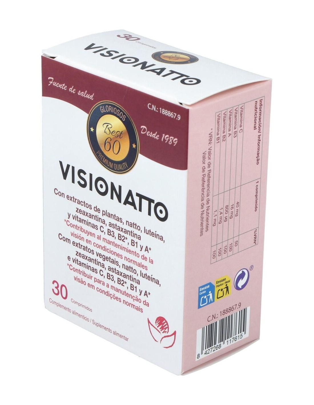 Las pantallas de los móviles y ordenadores, la sequedad del aire por la calefacción, realizar esfuerzos con la vista o el deterioro de la vista por la edad perjudica la salud de nuestros ojos. Además, tener un colesterol elevado, el consumo de tabaco, la edad y llevar una vida sedentaria puede aumentar el riesgo de que se formen coágulos en el interior de los vasos y se formen obstrucciones vasculares, pudiendo afectar a la vena central de la retina o bien a algunas de las ramas dentro del ojo. Visionatto es un conjunto de ingredientes activos y vitaminas que ayudan a mantener una buena salud ocular y contribuyen a una visión en condiciones normales. Composición activa por comprimido: