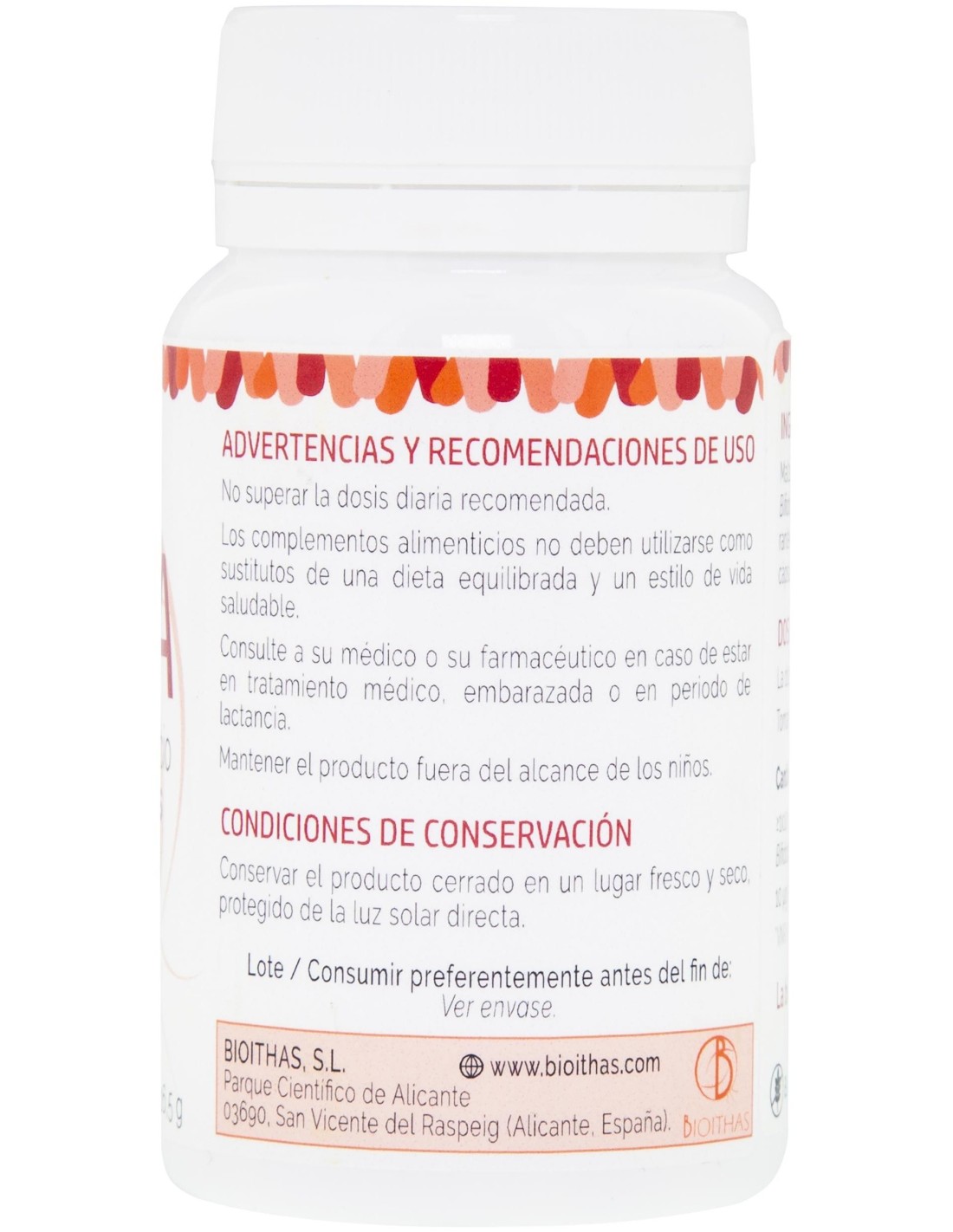 Agente de carga (celulosa), agente de recubrimiento (hidroxipropilmetilcelulosa), mezcla de Lacticaseibacillus rhamnosus y Bifidobacterium longum, antiaglomerantes (sales magnésicas de ácidos grasos y dióxido de silicio), biotina.