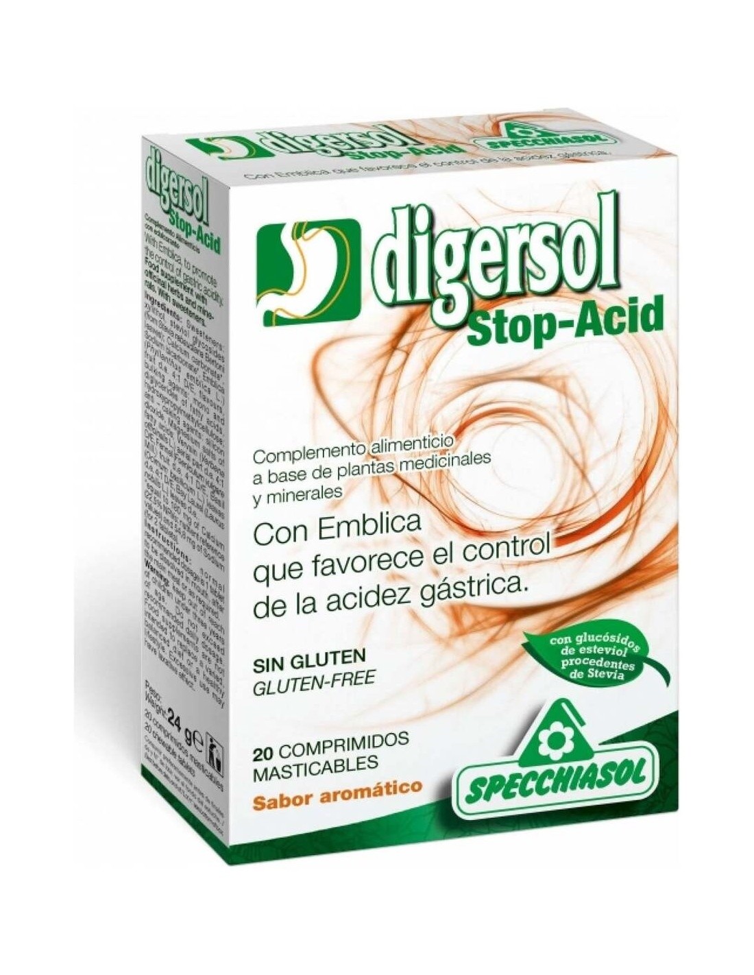Digersol Stop-Acid 20 Comprimidos Masticables de Specchiasol es un suplemento digestivo para personas con molestias estomacales, que ayuda a aliviar la acidez gracias a su fórmula masticable de rápida acción.