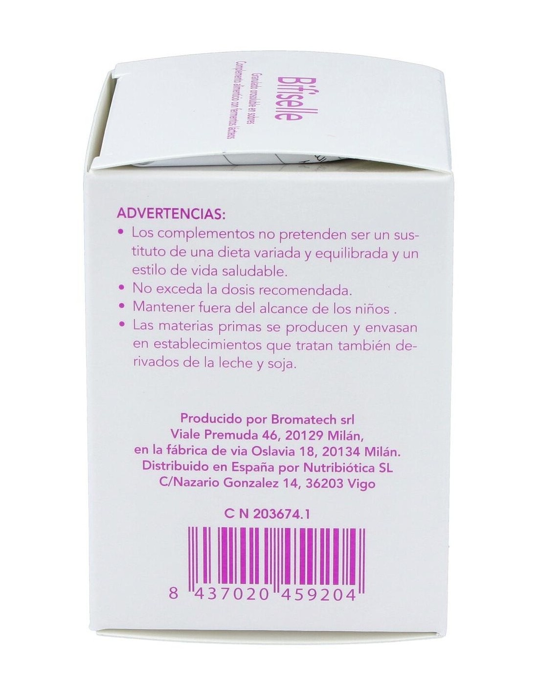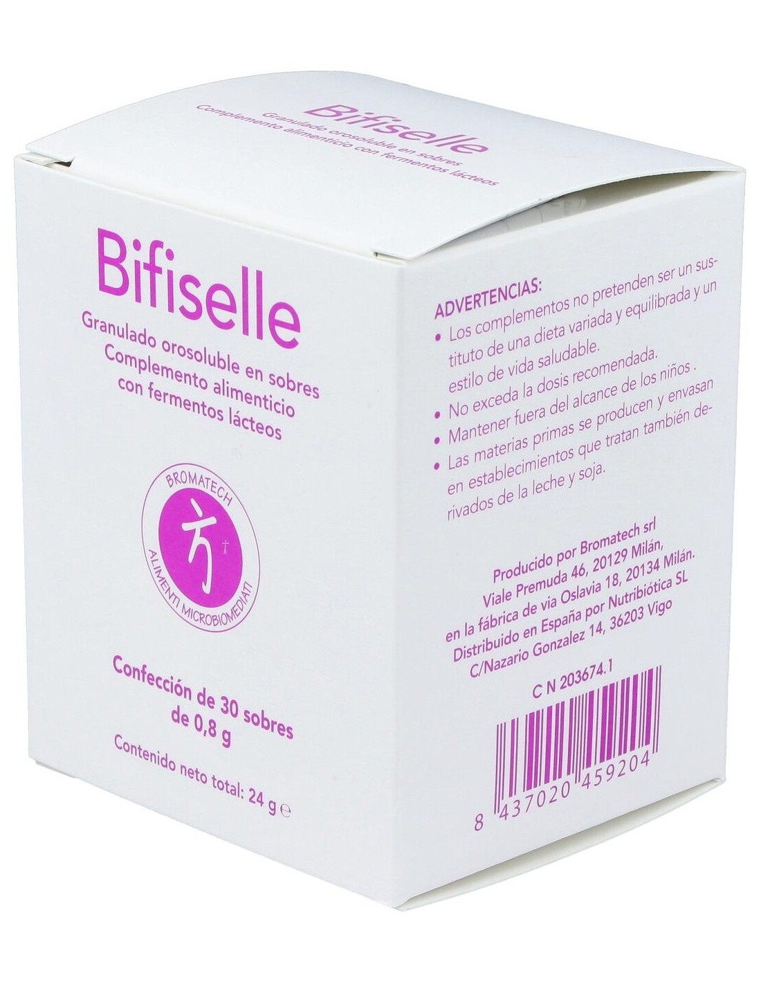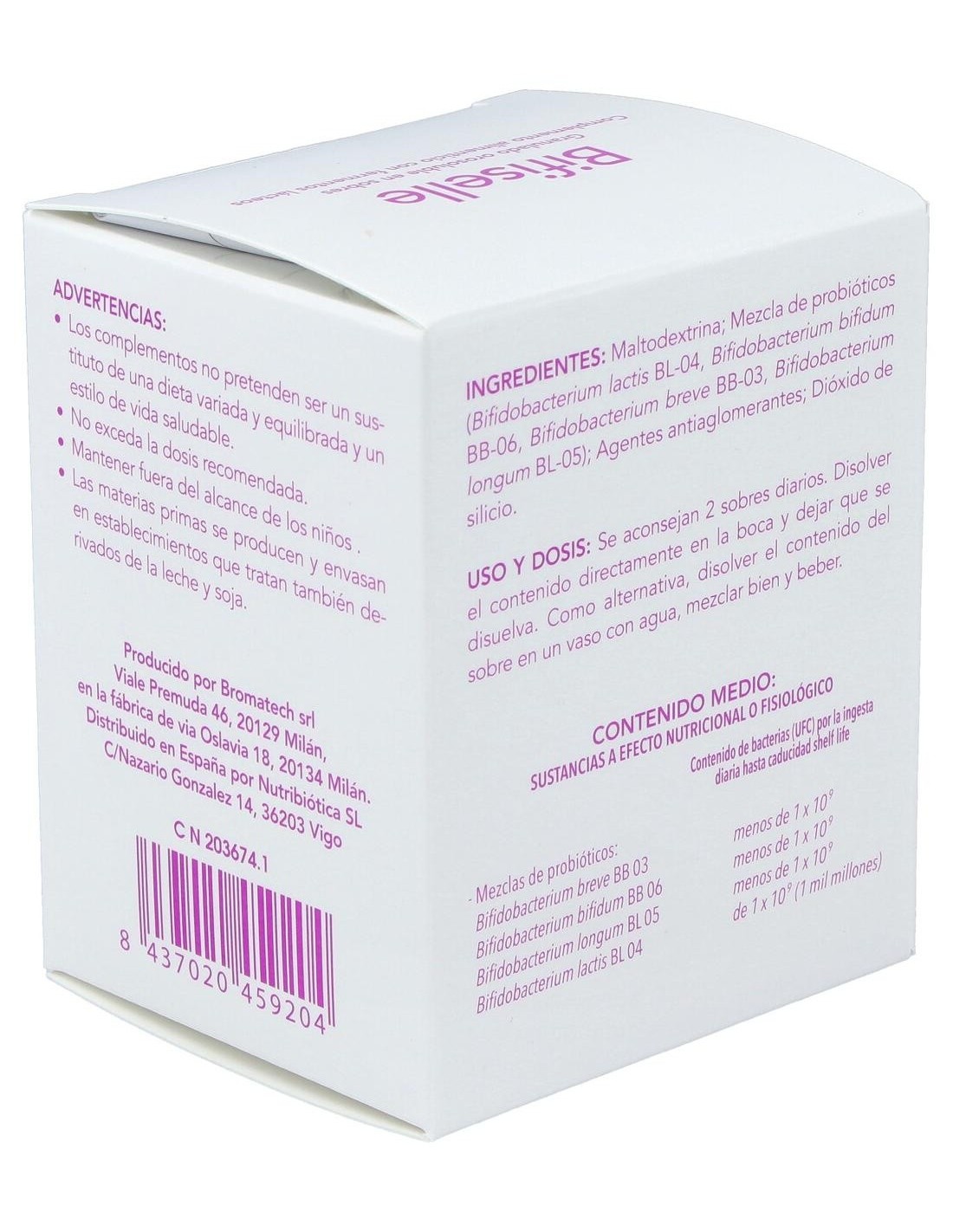 Bifiselle es un probiótico del laboratorio Bromatech, que en su formulación contiene 4 cepas diferentes de bifidobacterias. El género de las bifidobacterias es uno de los más estudiados y empleados como probióticos debido a sus importantes funciones beneficiosas tanto a nivel intestinal como extraintestinal en todos los rangos de edad, especialmente en población pediátrica y geriátrica.Su formulación contiene 4 bifidobacterias (B. breve, B.lactis, B. longum y B. bifidum), que pueden contribuir a moderar la ganancia de peso y mejorar la respuesta a la insulina durante el embarazo, modular el sistema inmune y madurar el sistema digestivo durante los primeros 1.000 días en bebés.Ingredientes:Mezcla de probióticos (Bifidobacterium lactis BL04, Bifidobacterium breve BB03, Bifidobacterium bifidum BB06, Bifidobacterium longum BL05).Modo de empleo:Tomar 2 sobres por día, después de las comidas, con un vaso de agua.Presentación:Envase de 30 sobres.