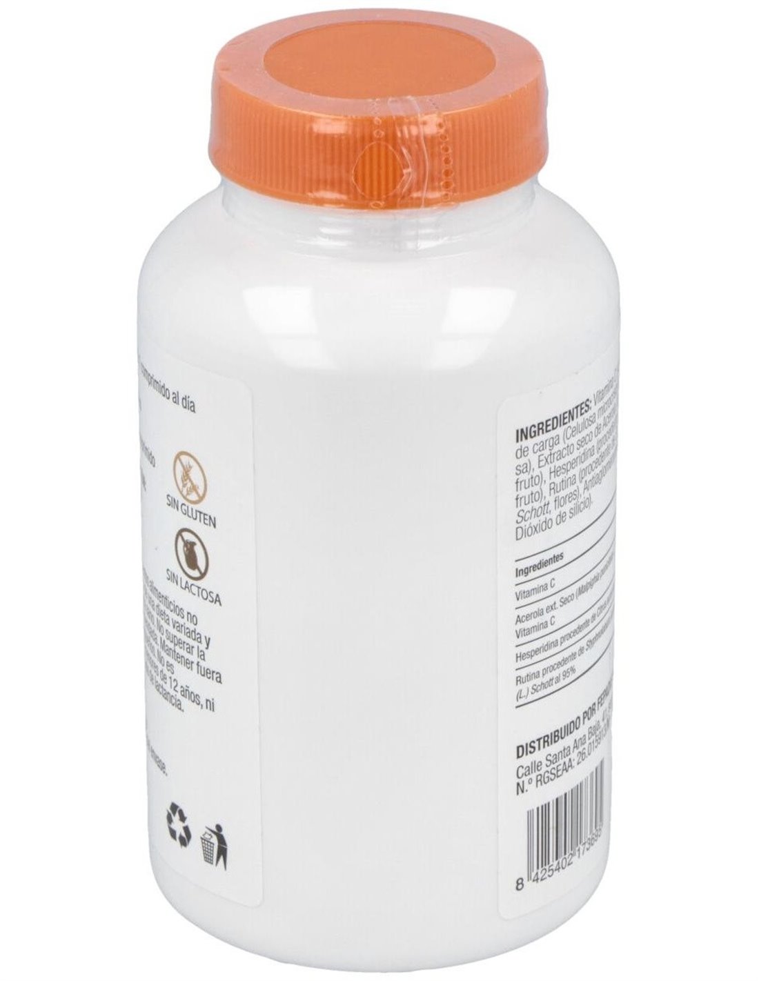Vitamina C (Ácido L-Ascórbico), Agentes de carga (Celulosa microcristalina, Hidroxipropilmetilcelulosa), Extracto seco de Acerola (Malpighia punicifolia L., fruto), Hesperidina (procedente de Citrus aurantium L., fruto), Rutina (procedente de Styphnolobium japonicum (L.) Schott, flores), Antiaglomerantes (Estearato de magnesio, Dióxido de silicio).