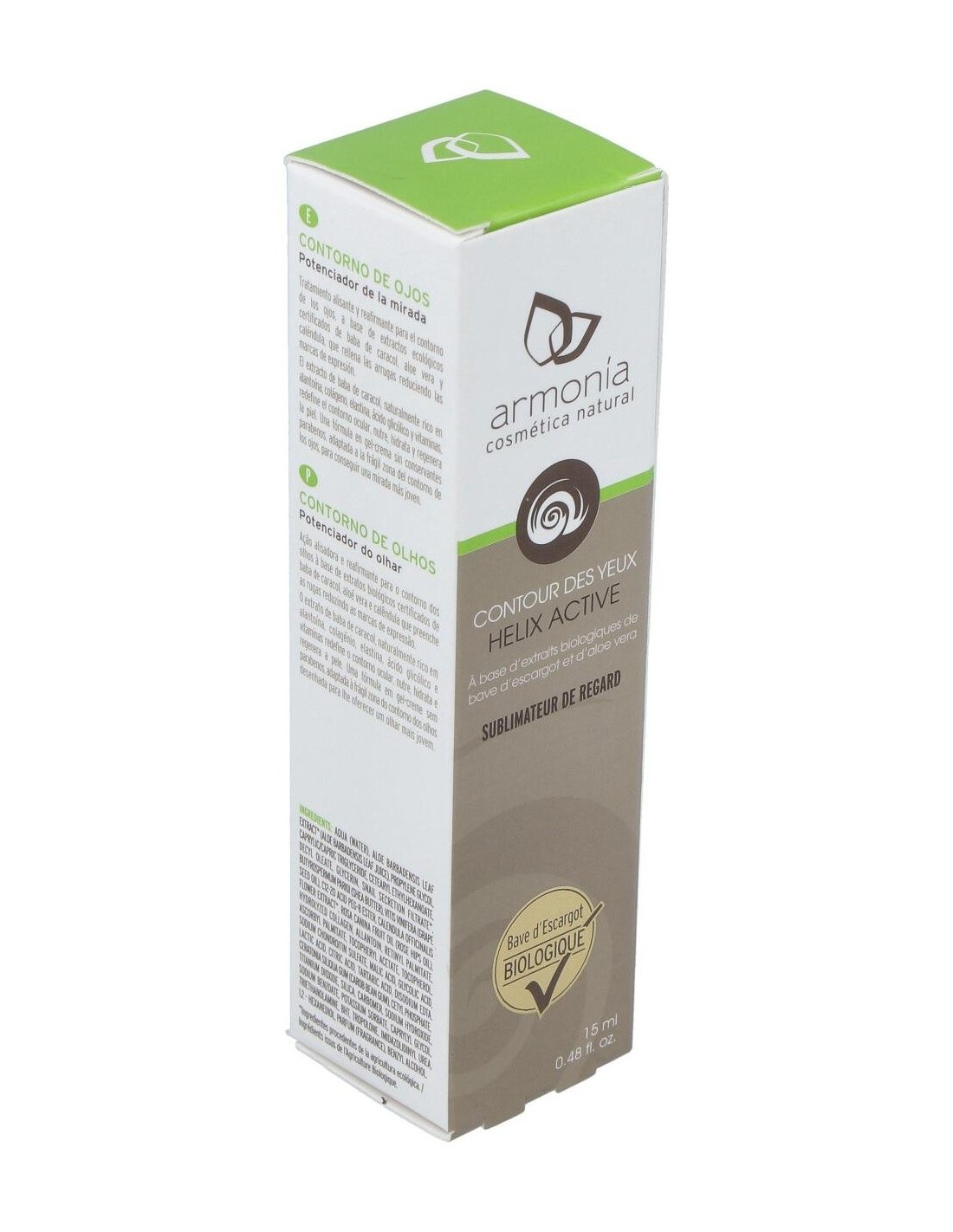 Helix Active Eco Contorno De Ojos Caracol Bio 15Ml de Armonia es un tratamiento formulado para el cuidado delicado de la piel alrededor de los ojos, ideal para personas que buscan una opción natural y respetuosa con el medio ambiente. Su composición está pensada para quienes desean mantener la hidratación y suavidad en esta zona sensible.