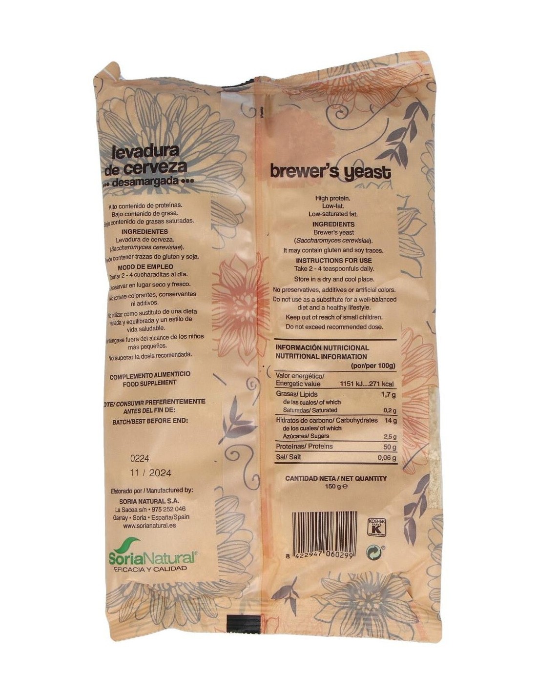 Este producto está elaborado a partir de levadura de cerveza cuidadosamente procesada para eliminar el amargor, manteniendo sus componentes nutricionales. Su formato en polvo y envase compacto permiten una dosificación sencilla y un almacenamiento cómodo.