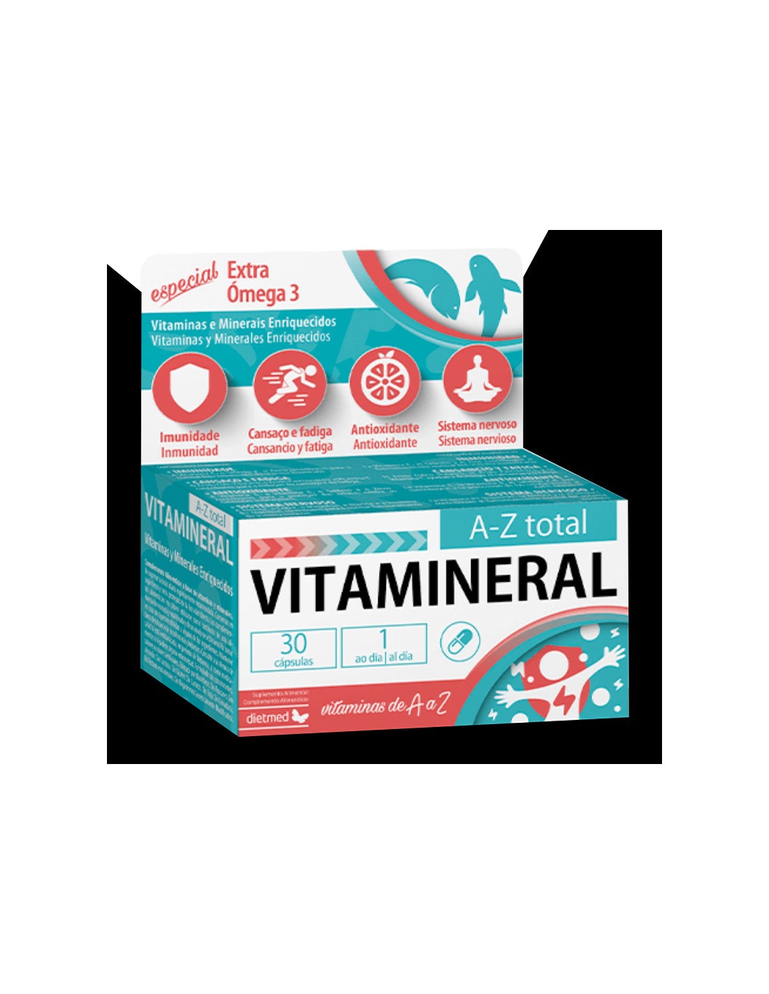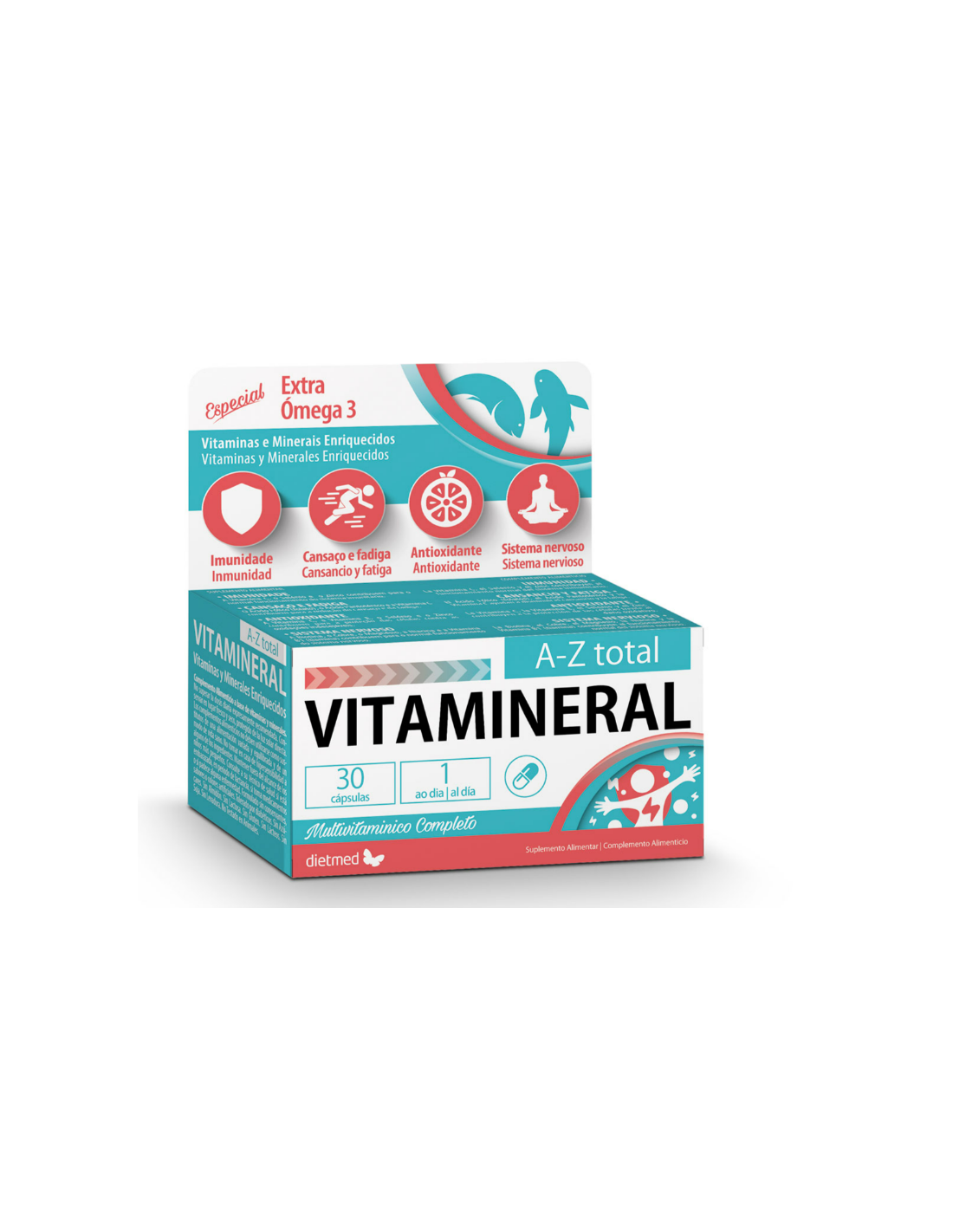 Vitamineral A-Z Total 30Perlas de Dietmed es un suplemento multivitamínico-mineral para adultos que contribuye al mantenimiento del bienestar general mediante una fórmula equilibrada de nutrientes esenciales.