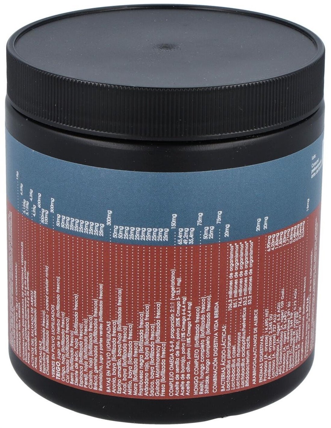 300 mg de verdes en polvo liofilizados (jugo de hierba de trigo, hoja de ortiga, col rizada, berro, hoja de diente de león, espinaca, hoja perejil, hoja de cilantro, germinados brécol, jugo y partes verdes de remolacha).