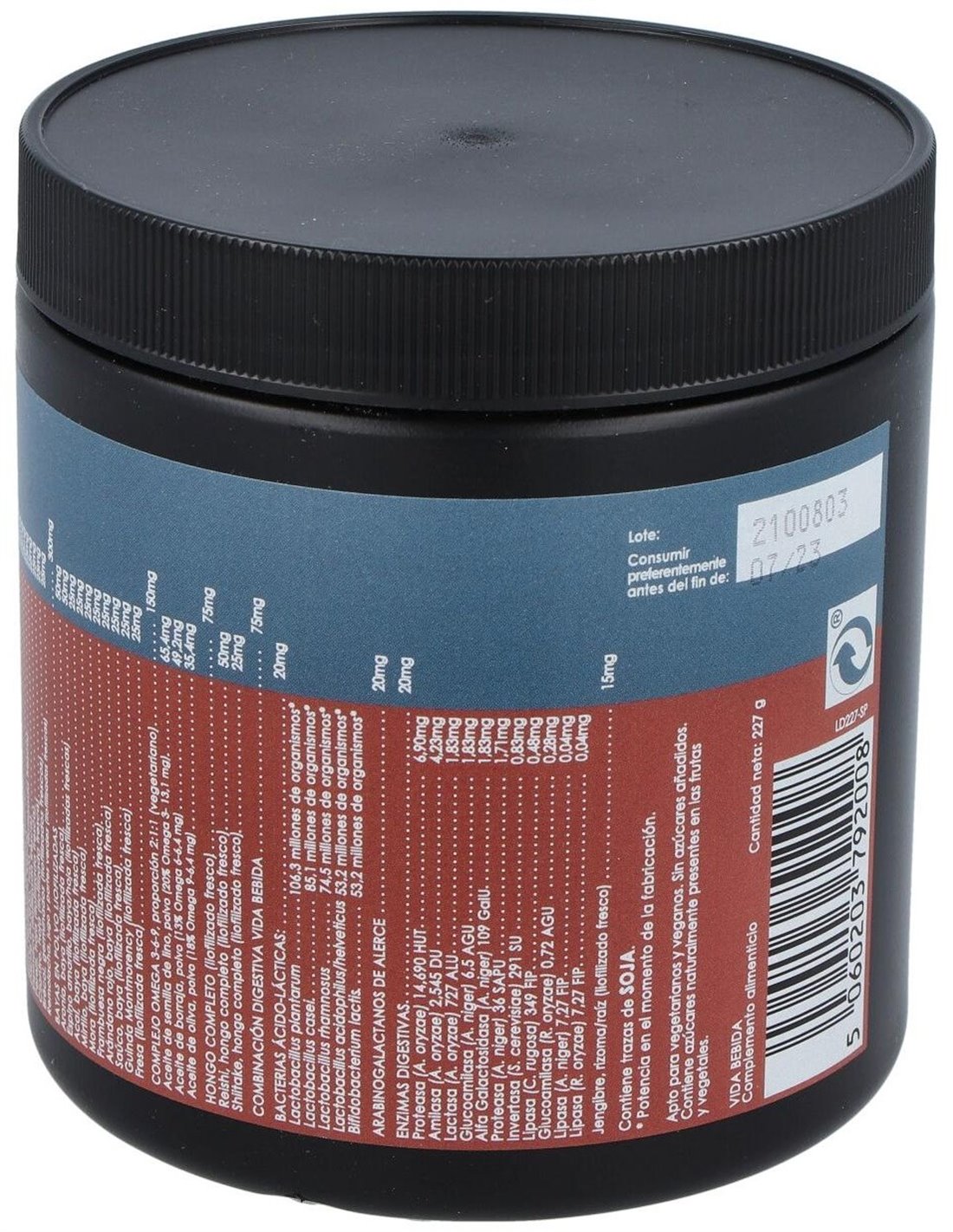 Vida Bebida es un suplemento alimenticio rico en antioxidantes, nutrientes para el organismo, y beneficioso para el sistema digestivo. Además, posee un efecto revitalizante y puede ayudar al sistema inmune. Ingredientes por dosis diaria (12 gramos):