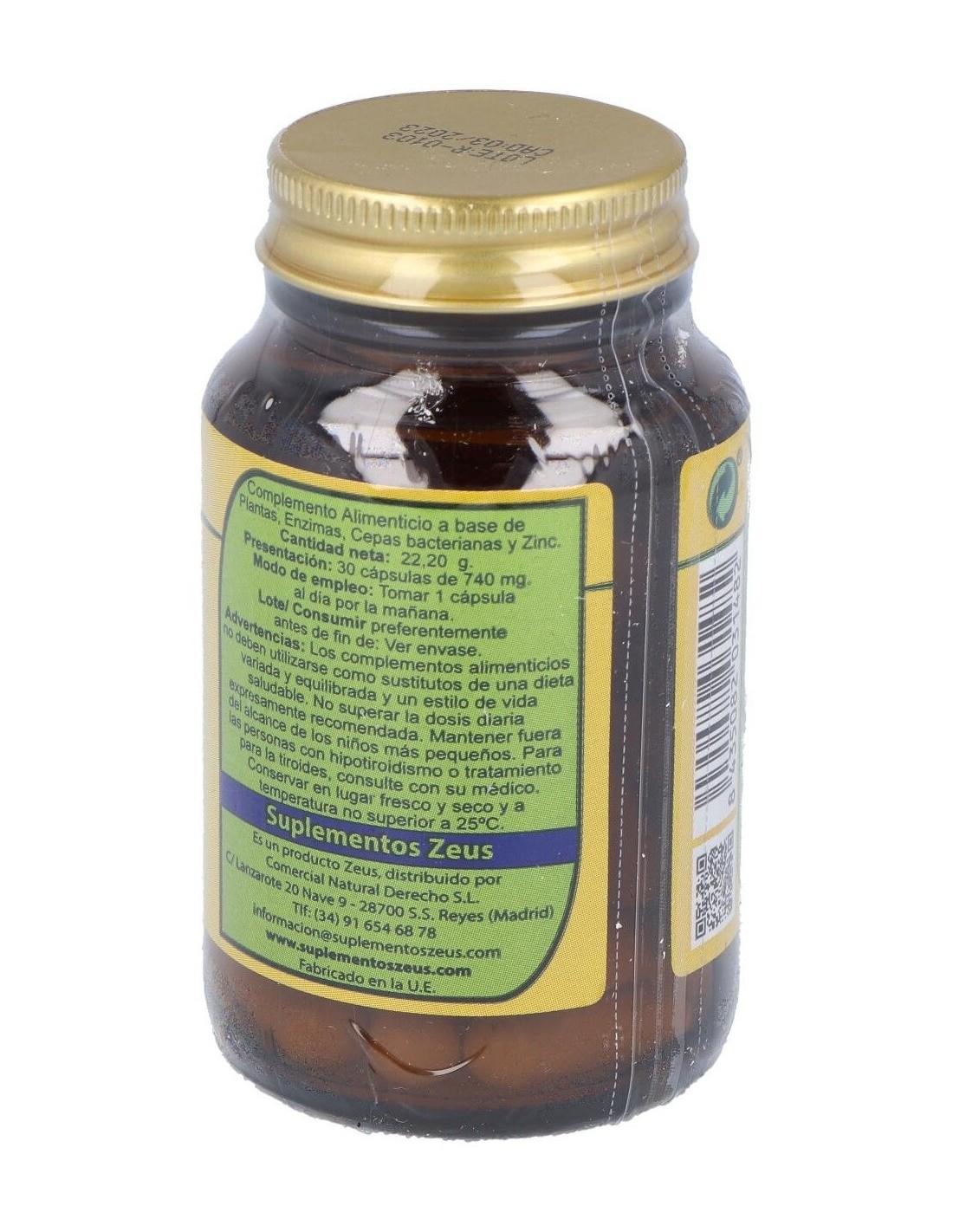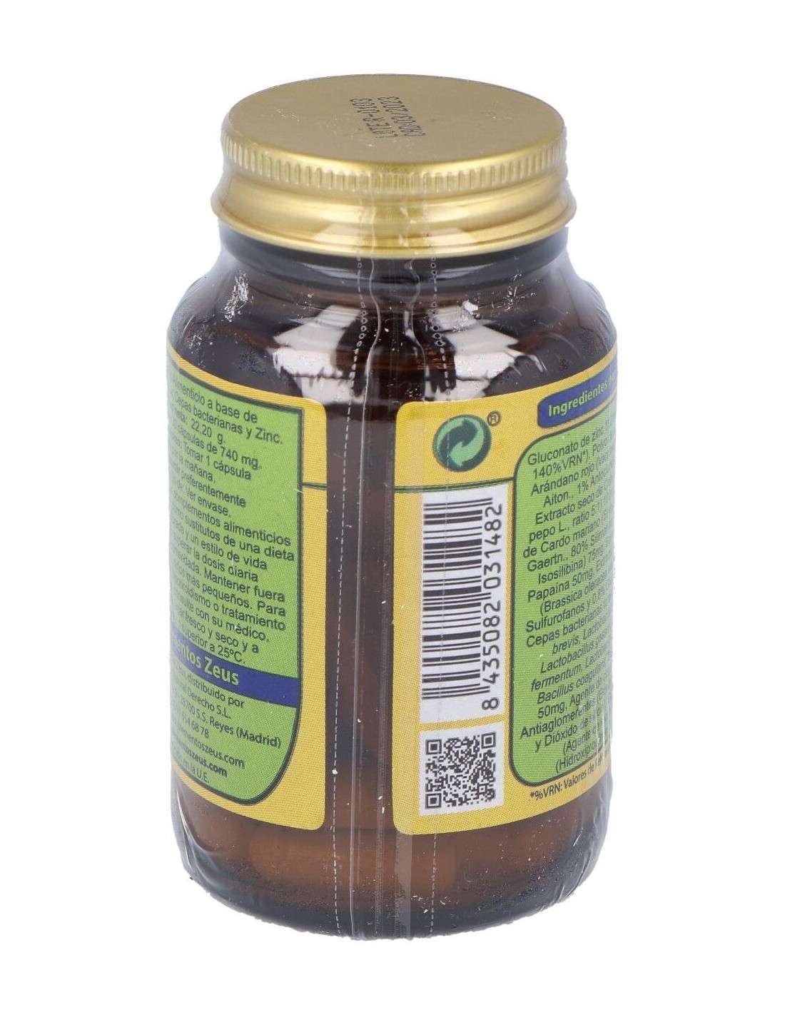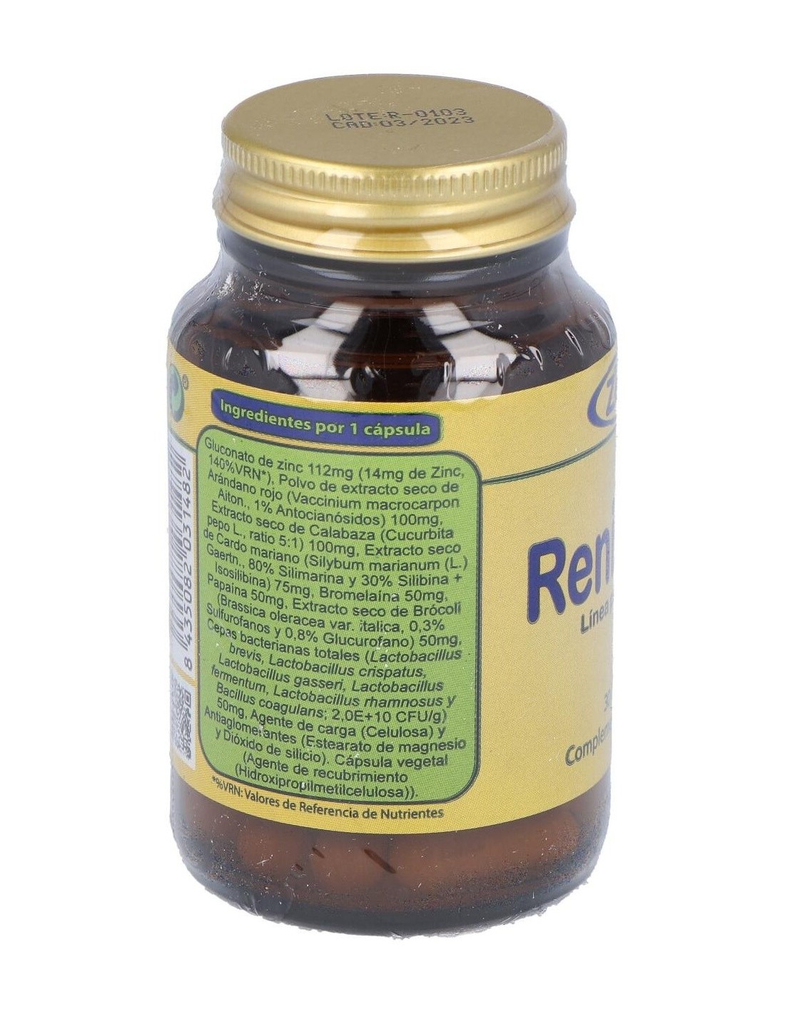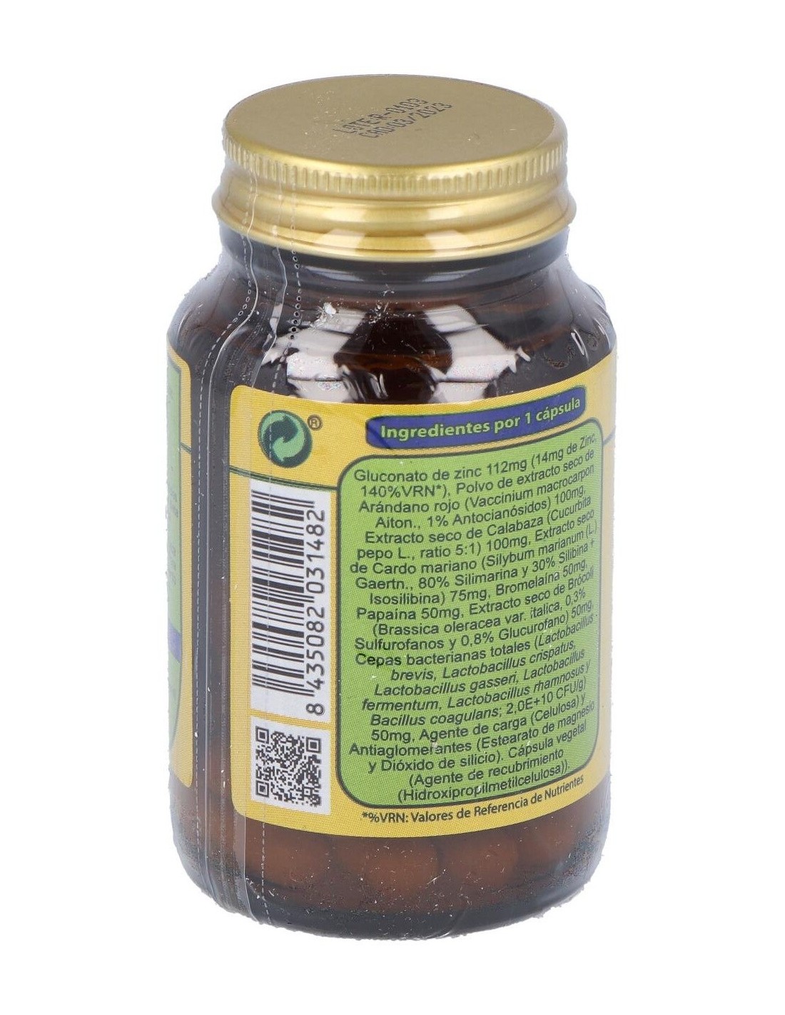 Gluconato de zinc (14mg de Zinc, 140%VRN*) 112mg. Extracto seco de Arándano rojo (Vaccinium macrocarpon Aiton., 1% Antocianósidos) 100mg. Extracto seco de Calabaza (Cucurbita pepo L., ratio 5:1) 100mg. Extracto seco de Cardo mariano (Silybum marianum (L.) Gaertn., 80% Silimarina y 30% Silibina + Isosilibina) 75mg. Bromelaína 50mg. Papaína 50mg. Extracto seco de Brócoli (Brassica oleracea var. italica, 0,3% Sulfurofanos y 0,8% Glucurofano) 50mg. Cepas bacterianas totales (Lactobacillus brevis, Lactobacillus crispatus, Lactobacillus gasseri, Lactobacillus fermentum, Lactobacillus rhamnosus y Bacillus coagulans; 2,0E+10 CFU/g) 50mg.