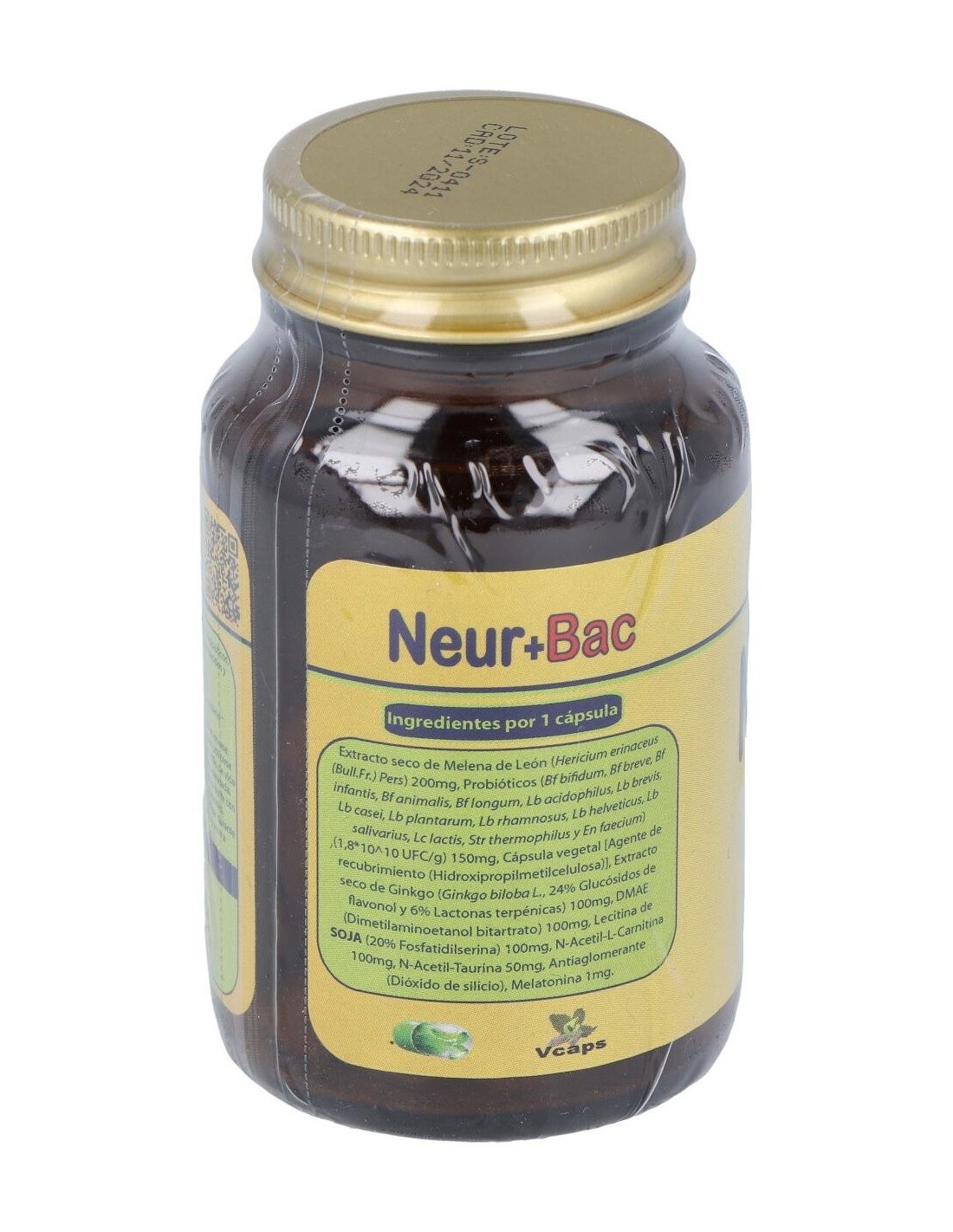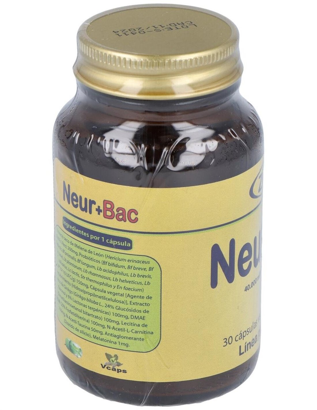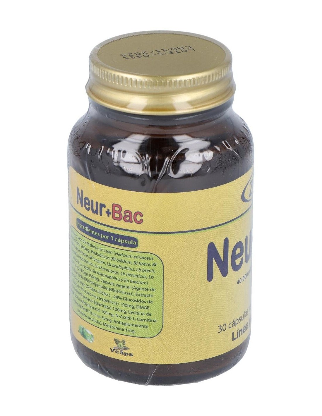 HERICIUM ERINACEUS (MELENA DE LEÓN) 200 MG, DMAE (DIMETILAMINOETANOL) 100 MG, ACETIL L-CARNITINA 100 MG, MEZCLA PROBIÓTICOS EQUIVALENTE A 40.000 MILLONES DE BACTERIAS INTESTINALES,GINKGO BILOBA (EXT. 24%) 100 MG, FOSFATIDILSERINA 100 MG, N-ACETIL TAURINA 50 MG, MELATONINA 1,9 MG.