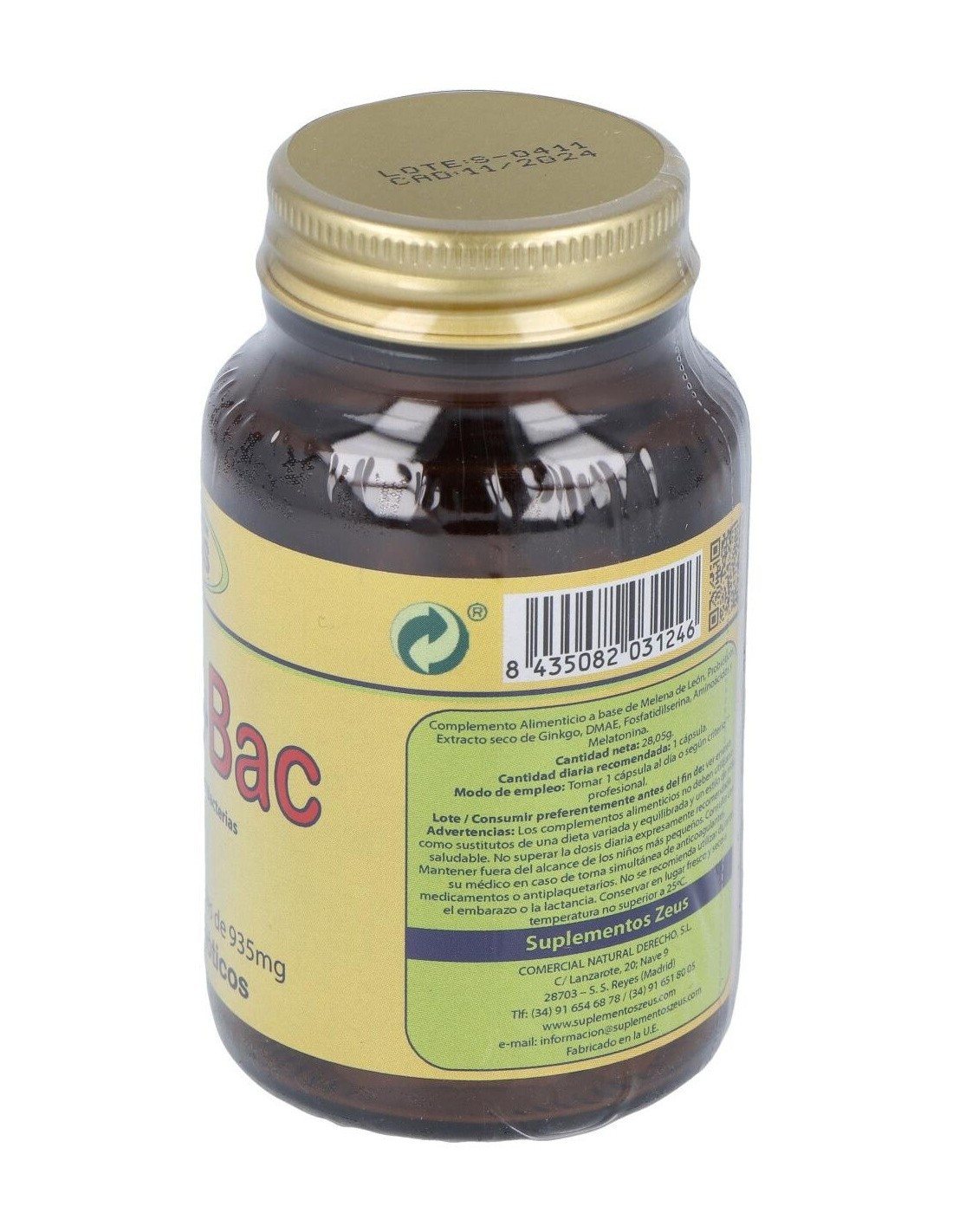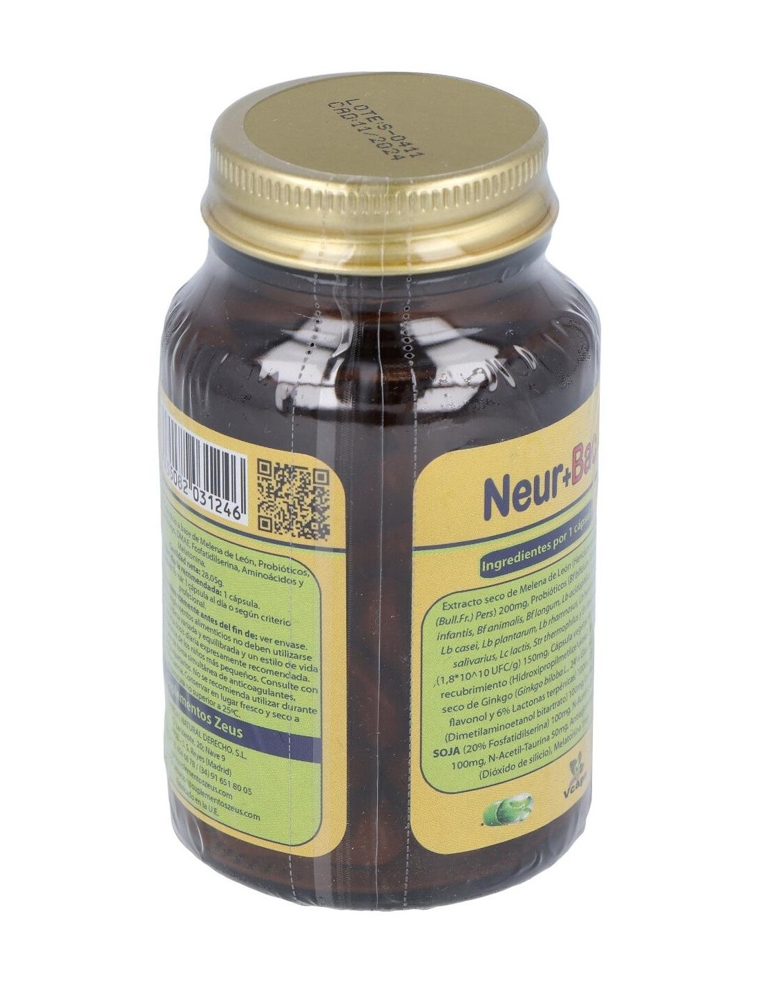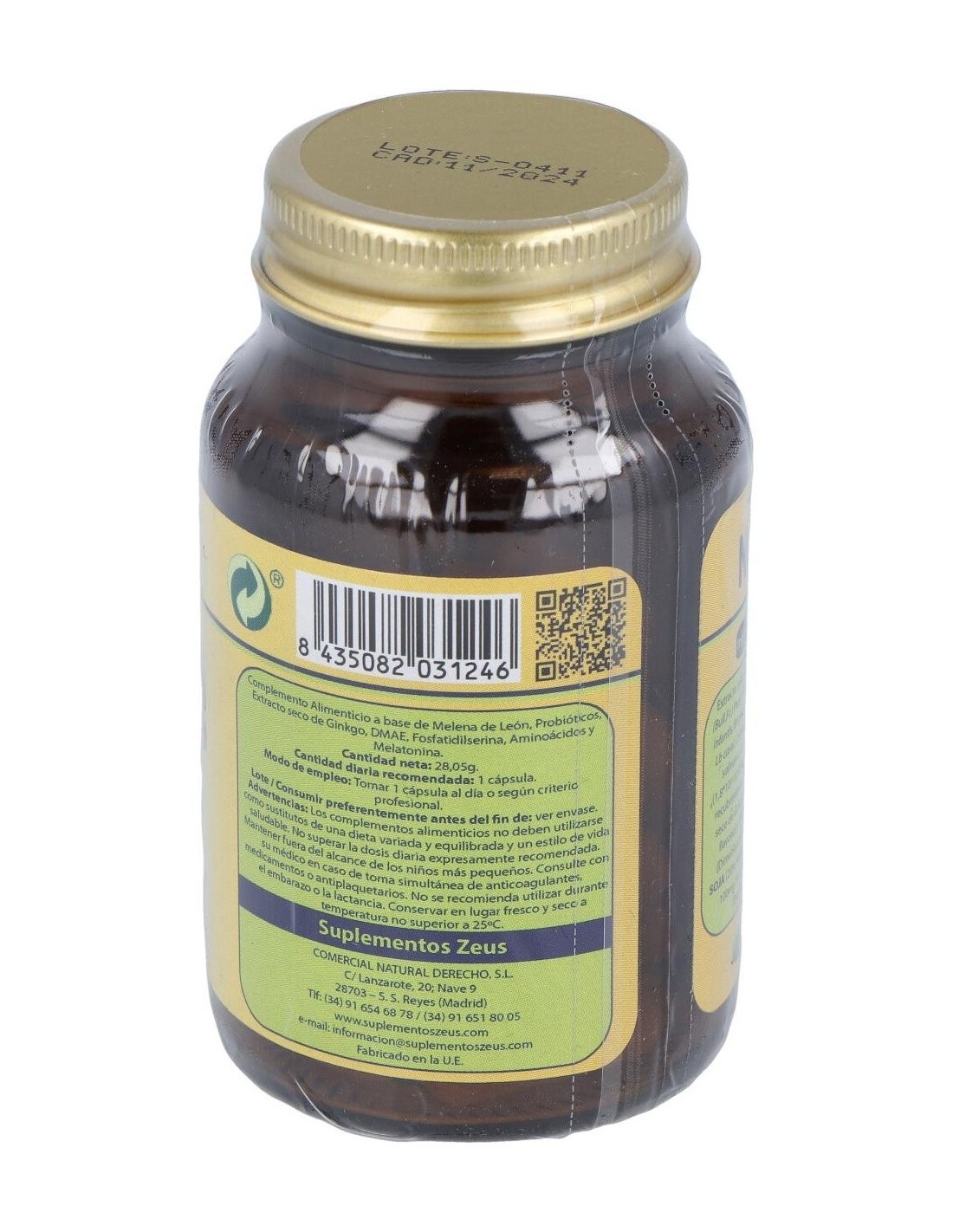 HERICIUM ERINACEUS (MELENA DE LEÓN) 200 MG, DMAE (DIMETILAMINOETANOL) 100 MG, ACETIL L-CARNITINA 100 MG, MEZCLA PROBIÓTICOS EQUIVALENTE A 40.000 MILLONES DE BACTERIAS INTESTINALES,GINKGO BILOBA (EXT. 24%) 100 MG, FOSFATIDILSERINA 100 MG, N-ACETIL TAURINA 50 MG, MELATONINA 1,9 MG.