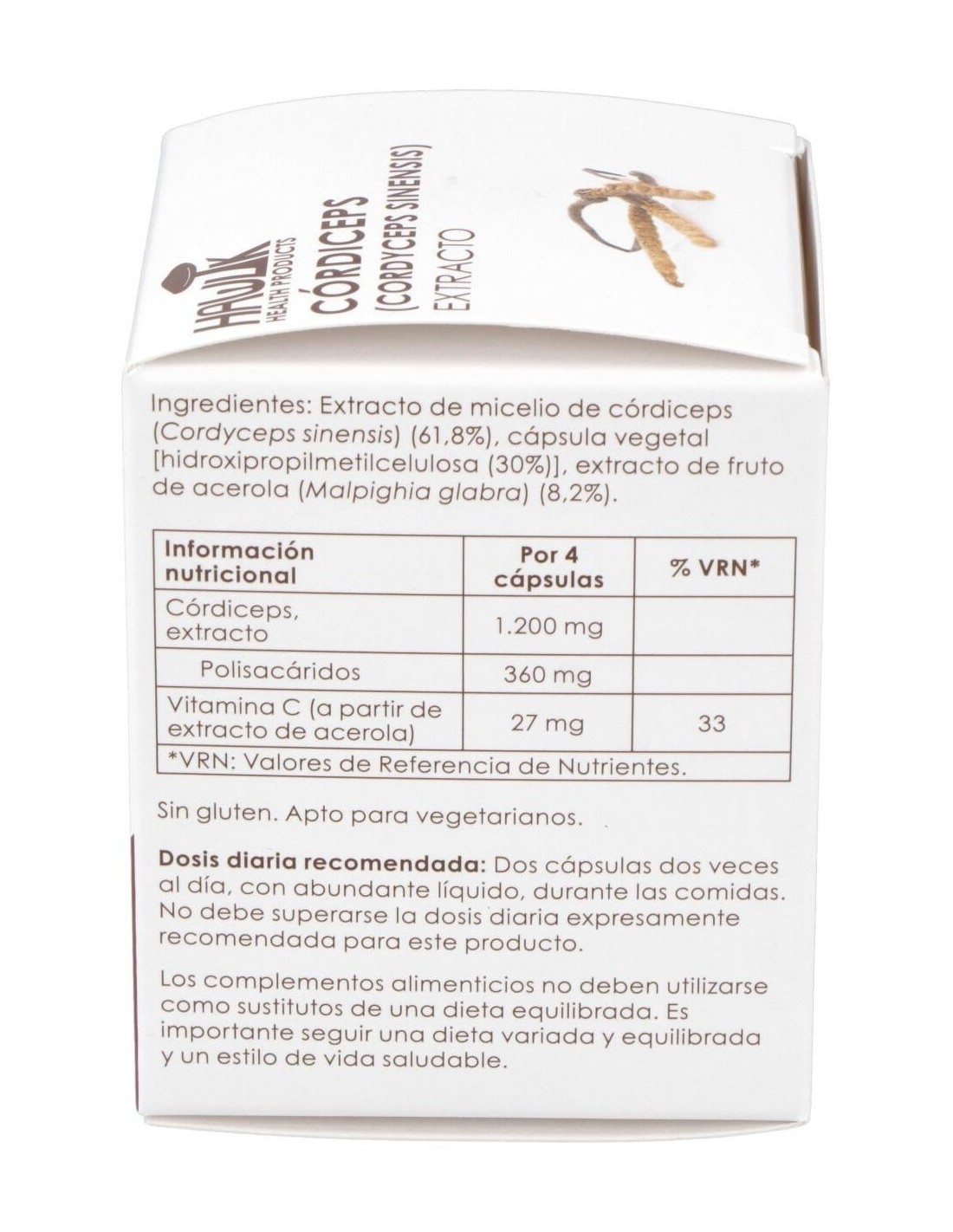 Complemento alimenticio a base de extracto de hongo córdiceps con alto contenido en polisacáridos, con extracto de acerola rico en vitamina C. Indicado para el rendimiento y recuperación física, en caso de patologías pulmonares y de la función cardíaca, en caso de disfunción sexual y para proteger la función hepática. Apto para vegetarianos y veganos.