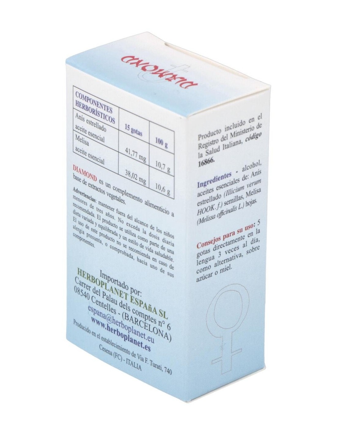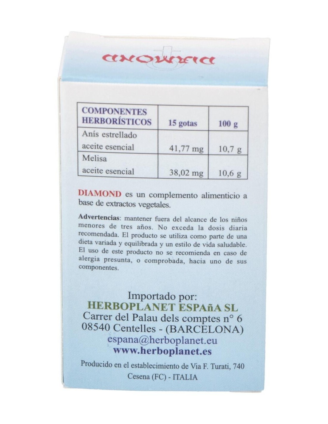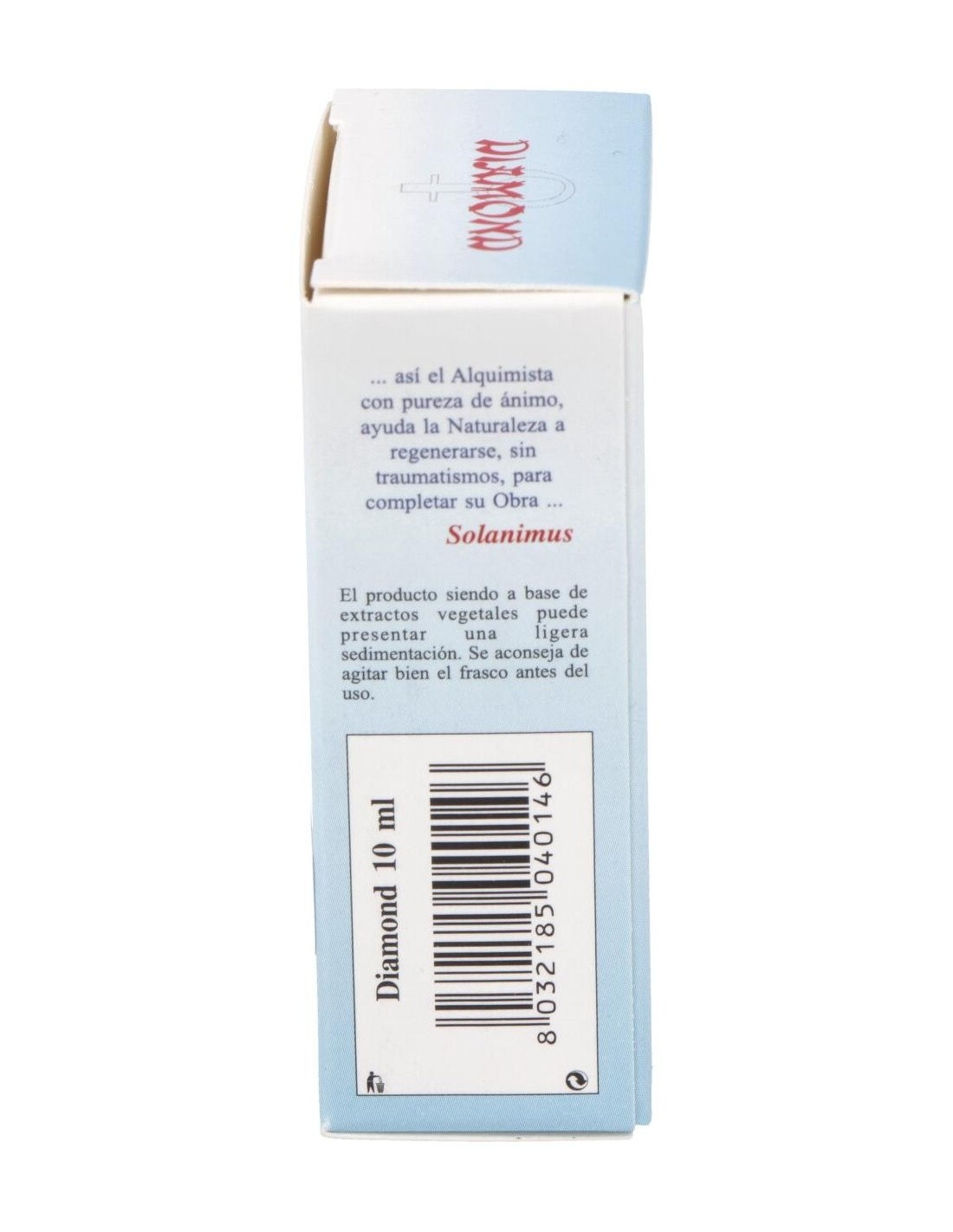 El Diamante es un concentrado de color índigo. El índigo pertenece al planeta benévolo Venus. Así mismo el color índigo y el diamante pertenecen al principio Agua y ambos son fríos y positivos en su naturaleza. Los libros de medicina india opinan que el diamante contiene los seis sabores: dulce, áspero, salado, picante, amargo y astringente.El Anís Estrellado tiene signatura de Júpiter y de Venus y a nivel psicosomático ayuda a digerir las situaciones incómodas. La Melisa tiene signatura Venus y Júpiter participando de la misma fuerza arquetipal del anís. Su acción es específica para la regulación del sistema nervioso autónomo. El estaño alquímico es el metal de Venus también en la tradición india. La piedra con la que se relaciona por analogía es el Diamante para la tradición Hindú mientras que en la tradición occidental la piedra de Venus es la esmeralda.El diamante induce al individuo a analizar las consecuencias de sus propias acciones. Promueve el pensamiento racional, permite comprender la relación entre las cosas más diversas. Estimula la capacidad de aprendizaje y facilita la integración de nuevos conocimientos con los ya adquiridos, permitiendo al sujeto aplicar rápidamente aquellos que ha asimilado. Por último, refuerza la capacidad de tomar decisiones claras precisas y de resolver los problemas.Principios activos: