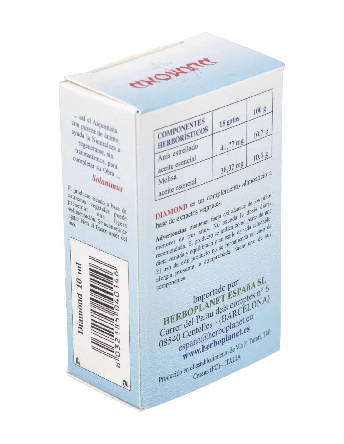 Ingredientes por 10 ml:QSA (Quintaesencia Espagírica Alquímica de Solanimus) de Anís estrellado ((Illicium verum HOOK. f.) 41,77 mg, QSA (Quintaesencia Espagírica Alquímica de Solanimus) de Melisa (Melissa officinalis L.) 38,02 mg. Cobre alquímico. Diamante alquímico.Modo de empleo:Tomar 5 gotas directamente en la lengua 3 veces al día, como alternativa, sobre azúcar o miel.Presentación:Envase de 10 ml.