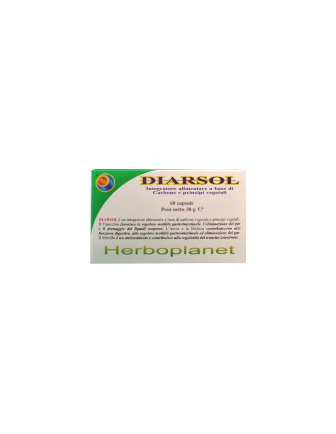 Diarsol es un complemento alimenticio a base de principios vegetales y lactobacillus acidophilus desde siempre noto por sus efectos benéficos. Hinojo, anís y melissa contribuyen a la regular motilidad gastrointestinal y a la eliminación de los gases. El arándano contribuye a la regularidad del tracto intestinal.Diarsol de Herboplanet es un complemento alimenticio recomendado en casos de colitis, diarrea (también en los niños), flatulencia, fermentación gástrica y/o intestinal, colitis diarreica, disentería.Principios activos: