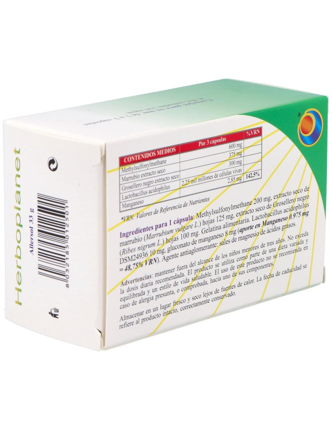 Allersol es un complemento alimenticio a base de Metil sulfonil metano (MSM), Marrubio, Grosollero negro, Lactobacillus acidophylus y Manganeso.El Mar