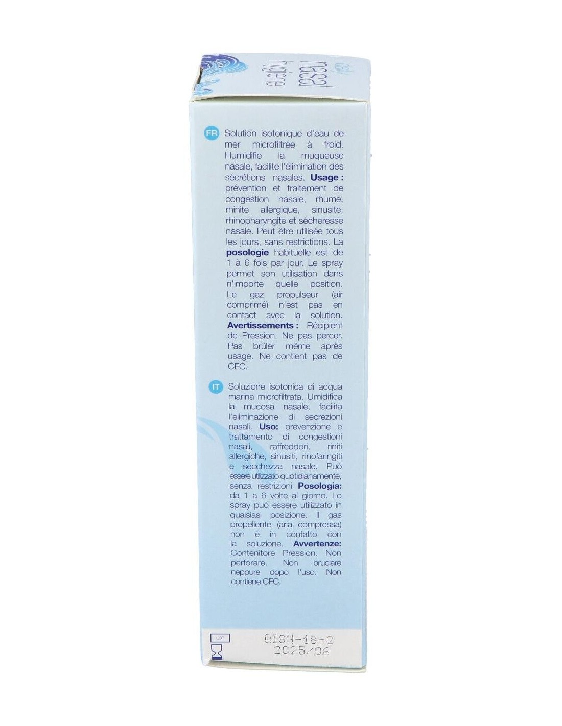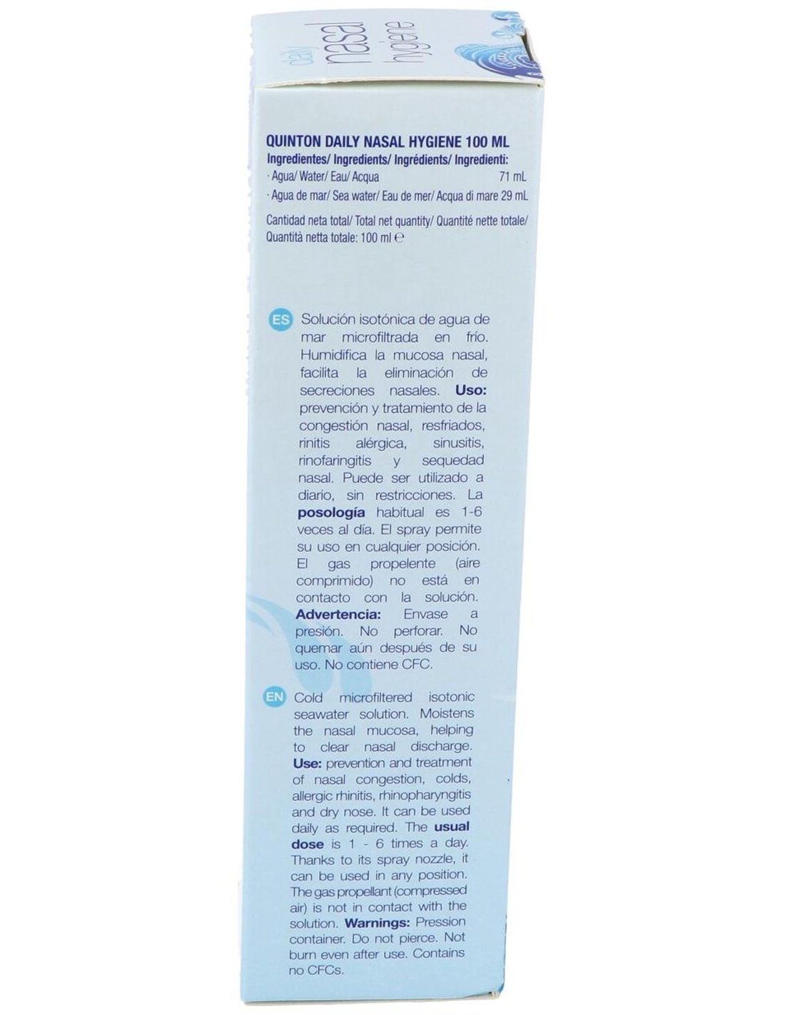 Solución salina isotónica microfiltrada en frío compuesta por agua (71%), agua de mar (29%), gas propulsor (aire comprimido).
