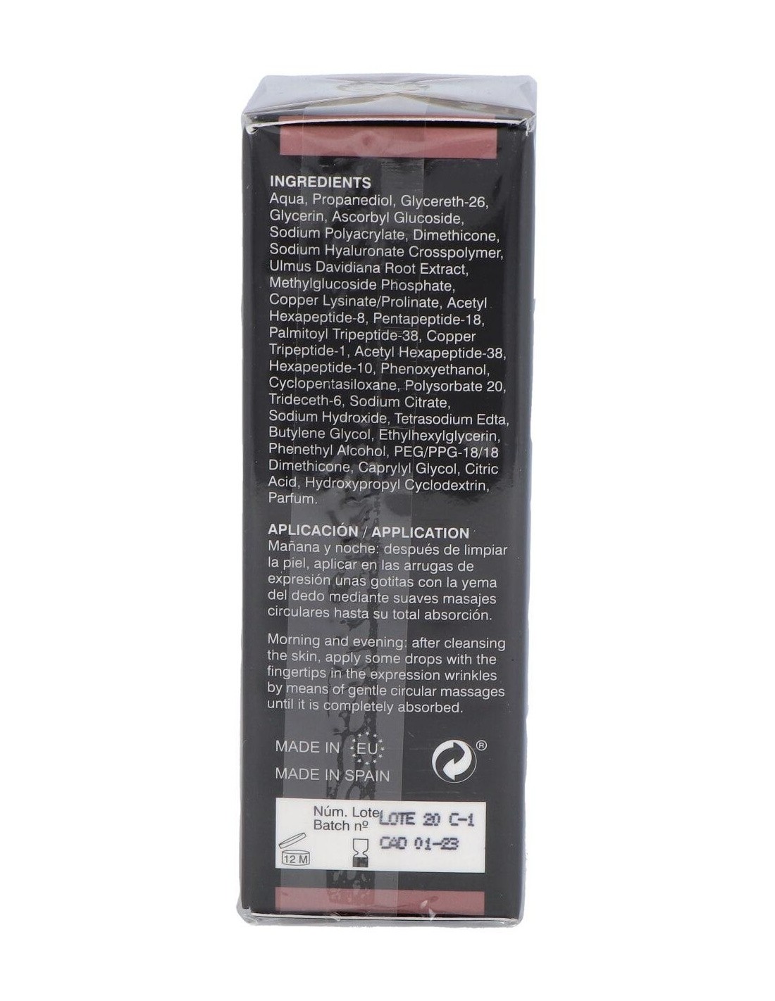 Ascorbyl glucoside, palmitoyl tripeptide-38, acetyl hexapeptide-38, hexapeptide-10, copper tripeptide-1, ácido hialurónico, ulmus extract, acetyl hexapeptide-8 + peptide-18, methyl glucoside phosphateproline lysinecopper complex.