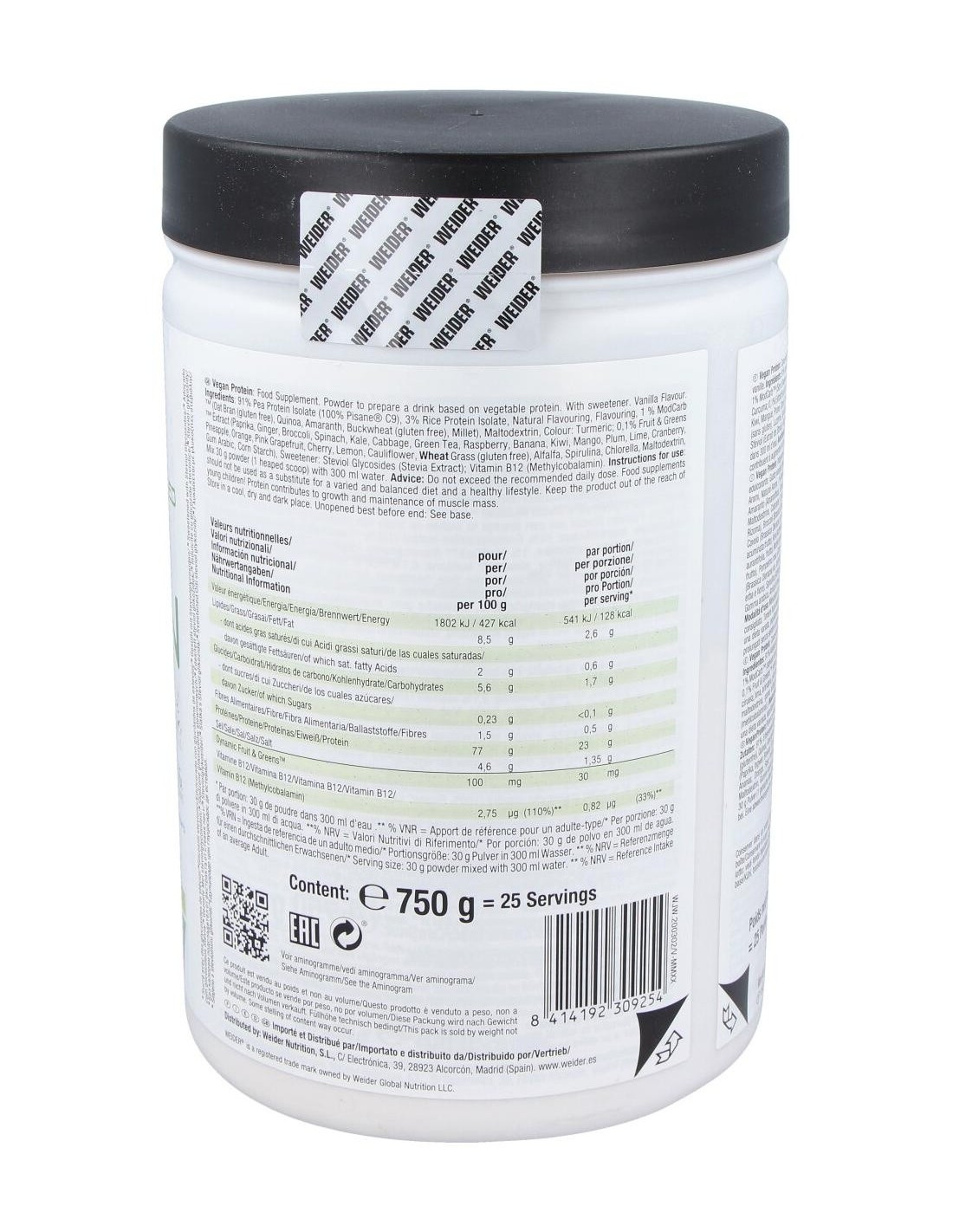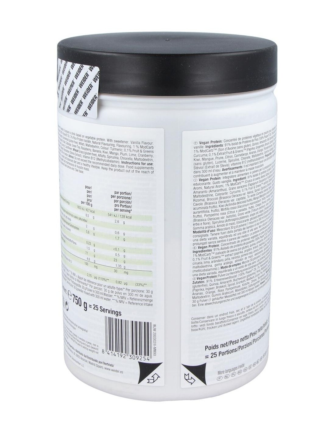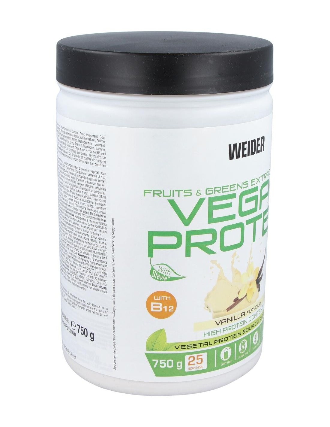 La composición de Weider Vegan Protein incluye proteínas derivadas de fuentes vegetales seleccionadas para ofrecer un perfil nutricional equilibrado. Su diseño está pensado para integrarse fácilmente en rutinas de alimentación saludable, apoyando estilos de vida activos y conscientes.