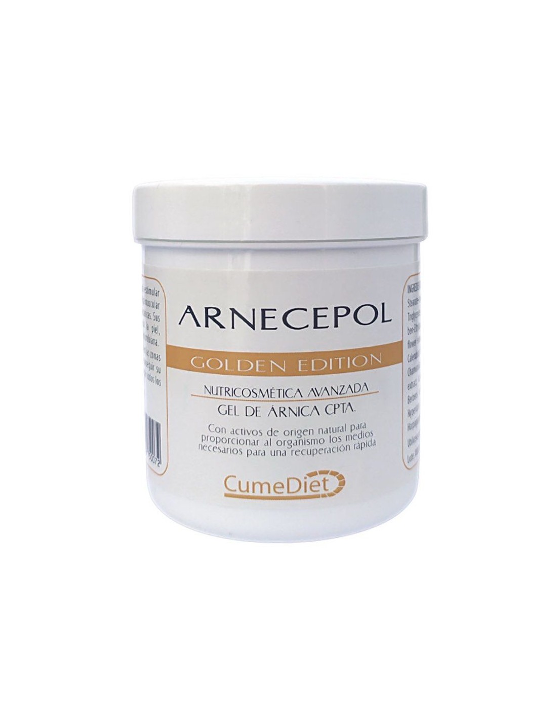 Gel Arnecepol Golden de Cumediet está indicado para estimular aquellas zonas del organismo que presentan fatiga muscular como consecuencia de haber sufrido lesiones mecánicas. Sus activos vegetales, actúan además reabsorbiendo los hematomas, tonificando la piel, aportando suavidad y ejerciendo una acción antimicrobiana.Ingredientes (INCI):Aqua, Glyceryl Stearate, Propylene Glycol, PEG-8 Stearate, Isopropyl Myristate, PEG-20 Stearate, Paraffin, C10-C18, Triglycerides, Stearic Acid, BHT, Glycerin, Phenoxyethanol, Methylparaben, Ethylparaben, Carbomer, Urea, Trietha- nolamine, Arnica Montana flower extract, Parfum, Limonene, Citral, Geraniol, Dypropilenglycol, Calendula officinalis flower extract, Hamamelis virginiana sheet extract, Chamomilla recutita inflorescence extract, Echinacea angustifolia root extract, Achillea millefolium flower extract, Bellis perennis extract, Berberis vulgaris root extract, Cinchona succirubra cortex extract, Hypericum perforatum flowerhead extract, Salix Alba sheet extract, Harpagophytum procumbes root extract, CI 42090, CI 42051.Modo de empleo:Aplicar mañana y noche en las zonas afectadas con suave masaje ascendente hasta conseguir su total absorción. Es importante aplicarse el producto todos los días.Presentación:Envase de 200 ml